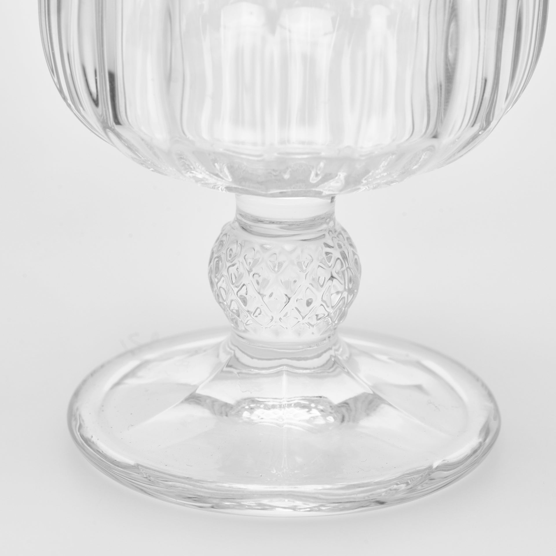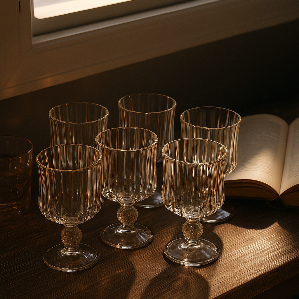 Realizzati in vetro trasparente lavorato con un elegante motivo a righe verticali, questi calici sono ideali per servire vino, acqua o cocktail, adattandosi perfettamente sia a tavole formali che a mise en place più moderne.