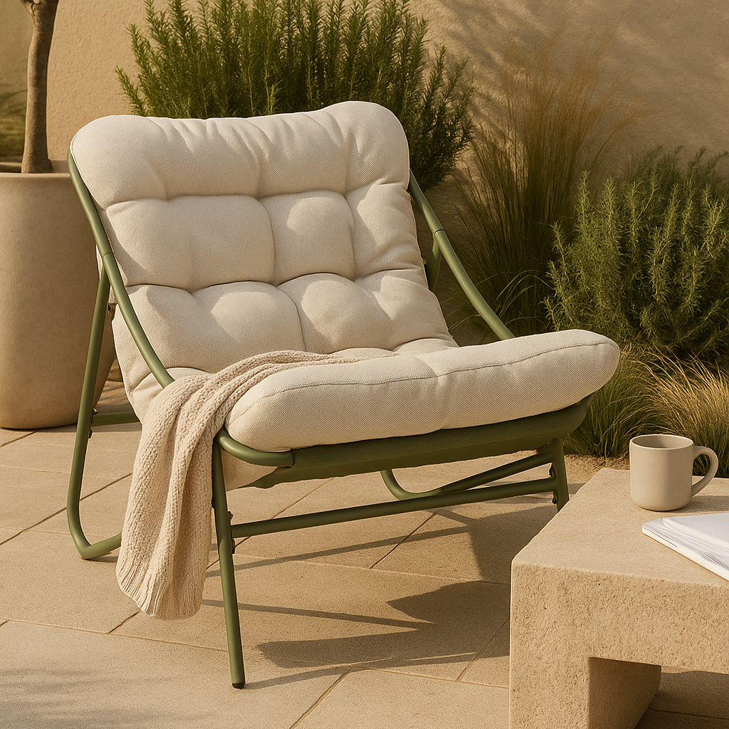 La seduta e lo schienale garantiscono un comfort ottimale e una sensazione di relax prolungata. La viteria in acciaio galvanizzato assicura solidità e stabilità alla poltrona, mentre il suo design invita al riposo e al benessere.