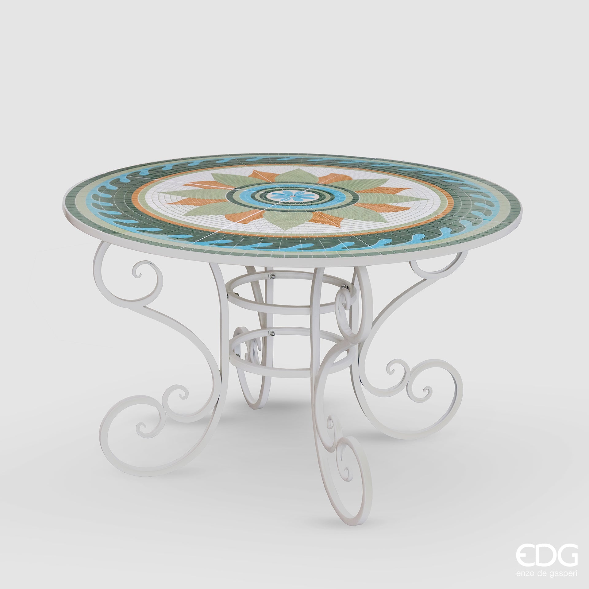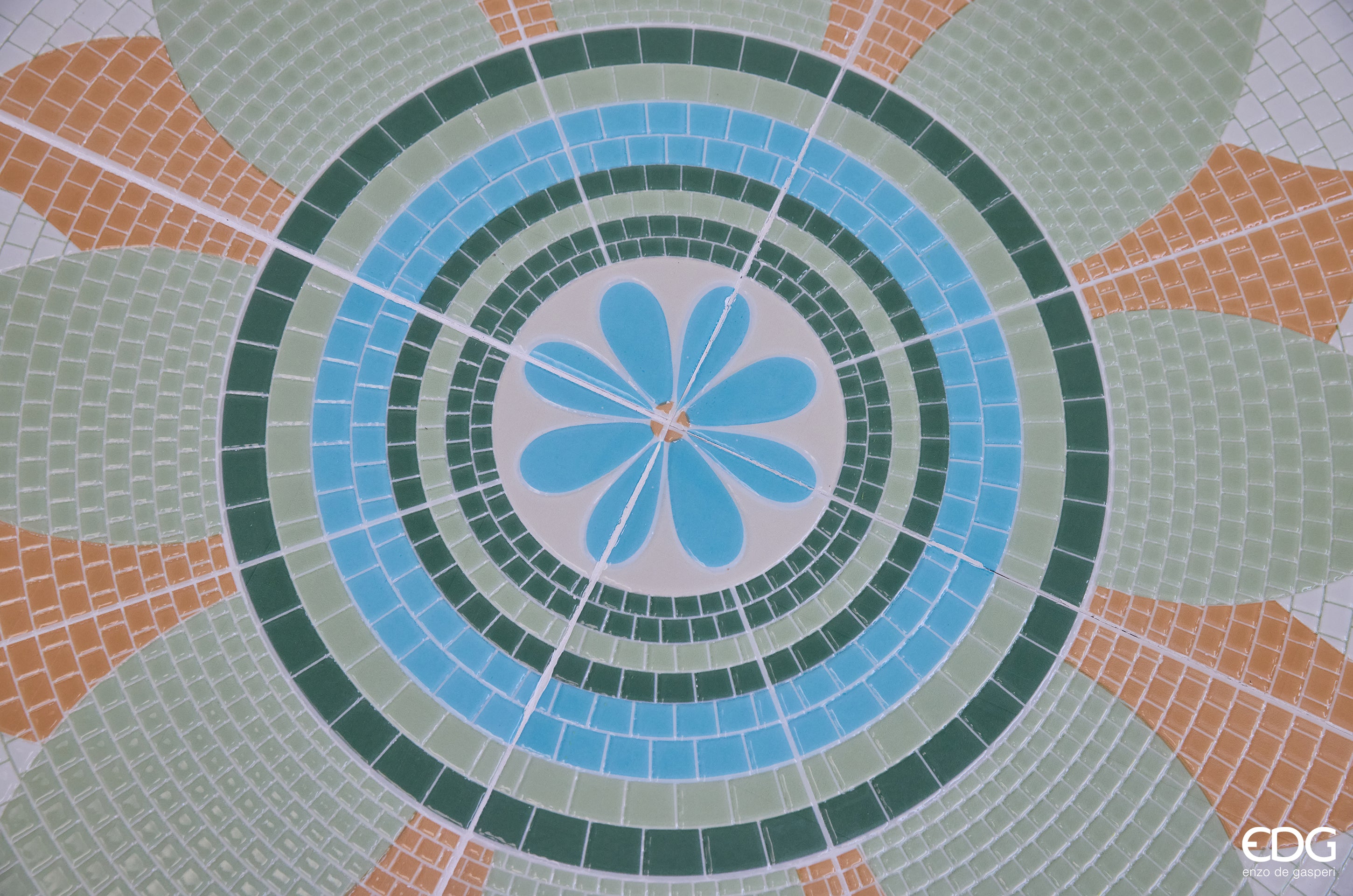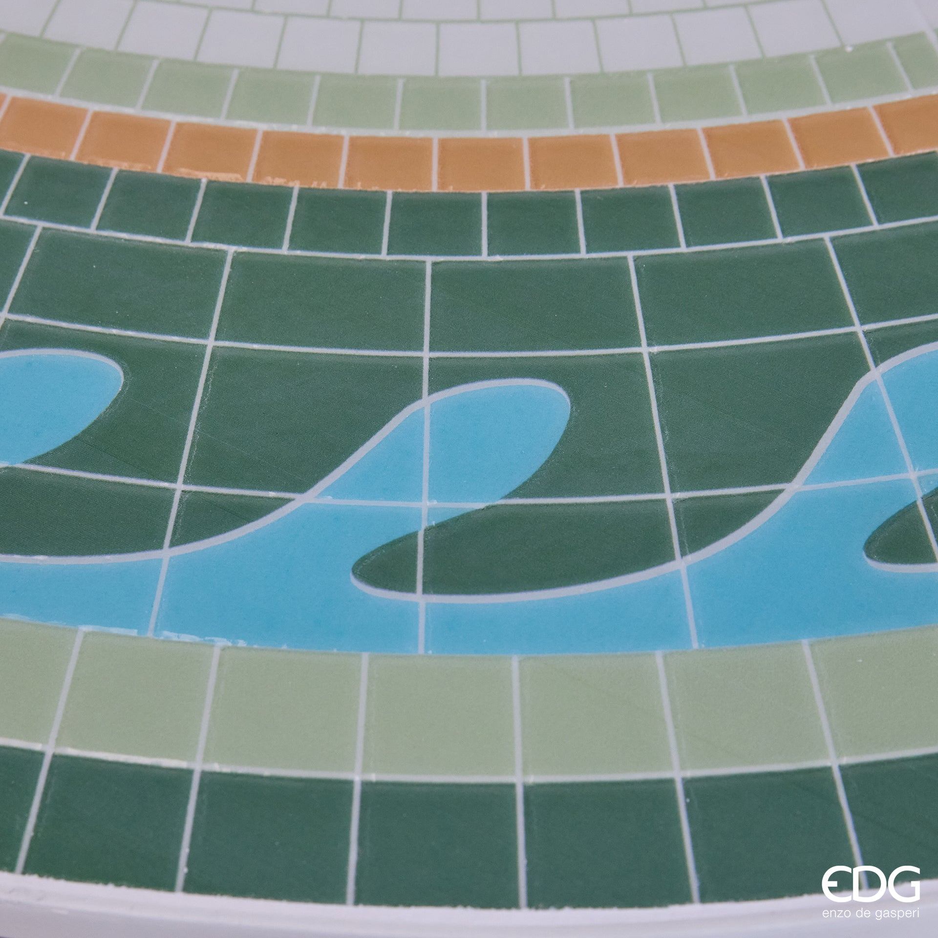 Il EDG Enzo De Gasperi Tavolo da Esterno Onde D120 cm è un raffinato tavolo rotondo in metallo, pensato per arredare con eleganza giardini, terrazze e verande. Il suo ampio piano decorato con motivo a mosaico effetto onde, nei toni del verde, azzurro e terracotta, dona personalità e stile agli spazi outdoor, creando un’atmosfera mediterranea e accogliente.