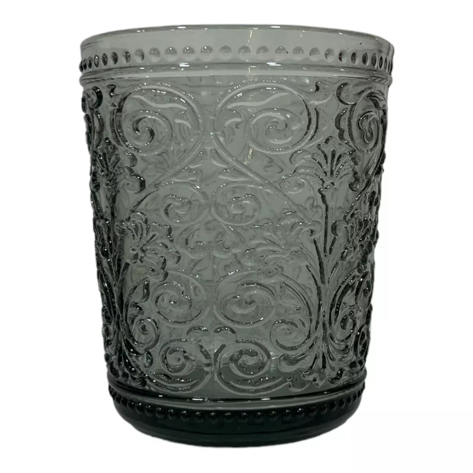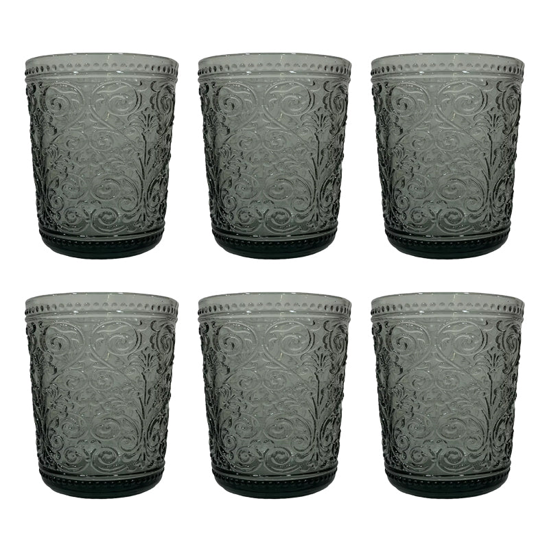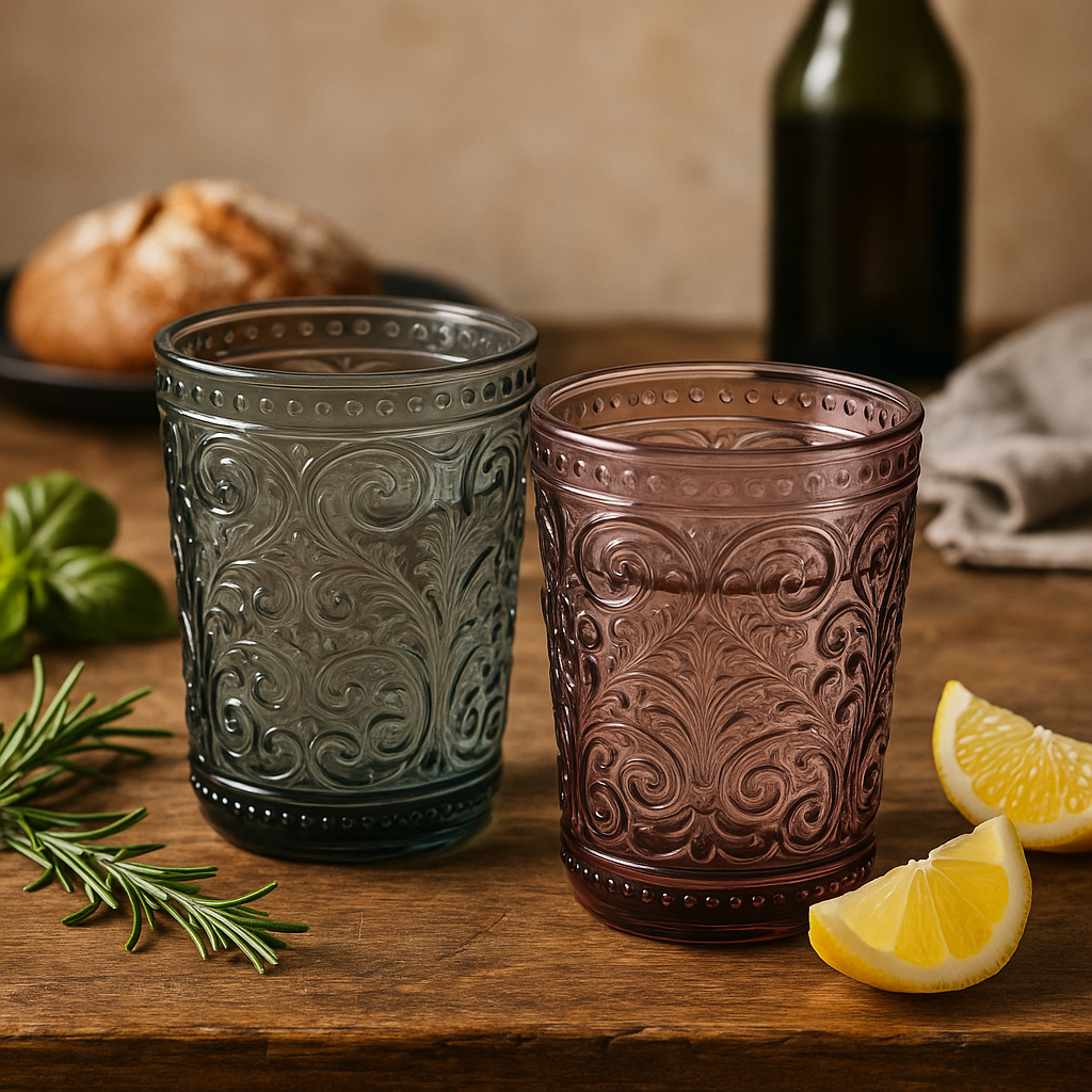 Realizzati in vetro trasparente con una raffinata lavorazione a rilievo ispirata alle foglie di acanto, questi bicchieri da 310 ml offrono un design ricco di fascino, perfetto sia per l’uso quotidiano che per mise en place più ricercate.