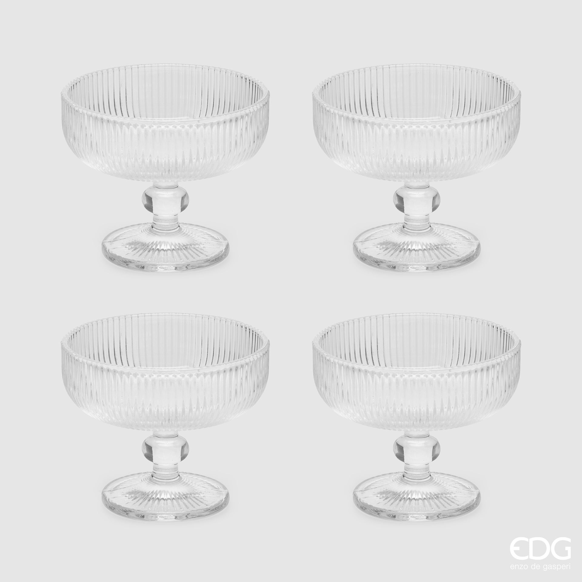 Il set di 4 coppette in vetro firmato EDG Enzo De Gasperi è l'ideale per impreziosire la tua tavola con uno stile raffinato e senza tempo. Realizzate in vetro trasparente lavorato, queste coppette da 250 ml combinano design classico e funzionalità, perfette per servire dessert, gelati, macedonie, mousse o antipasti.