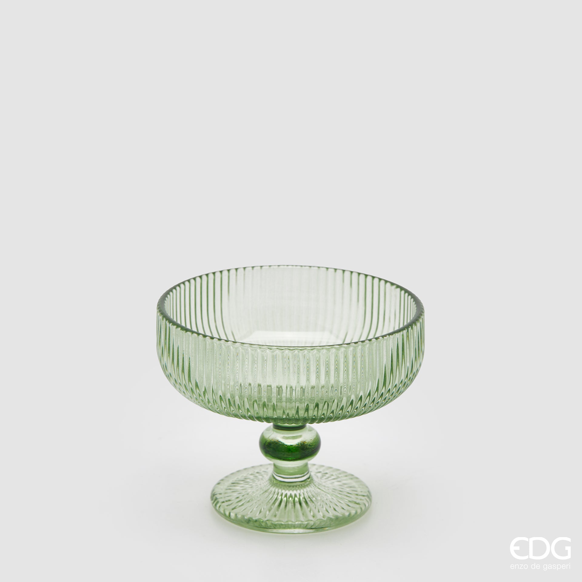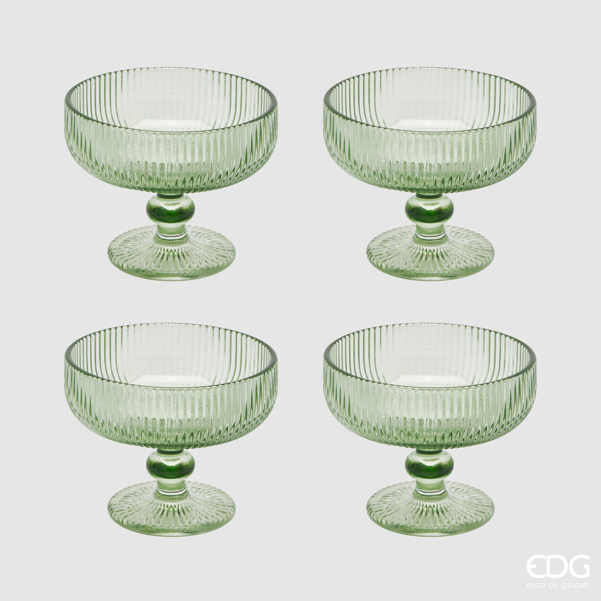 Il set di 4 coppette in vetro firmato EDG Enzo De Gasperi è l'ideale per impreziosire la tua tavola con uno stile raffinato e senza tempo. Realizzate in vetro trasparente lavorato, queste coppette da 250 ml combinano design classico e funzionalità, perfette per servire dessert, gelati, macedonie, mousse o antipasti.
