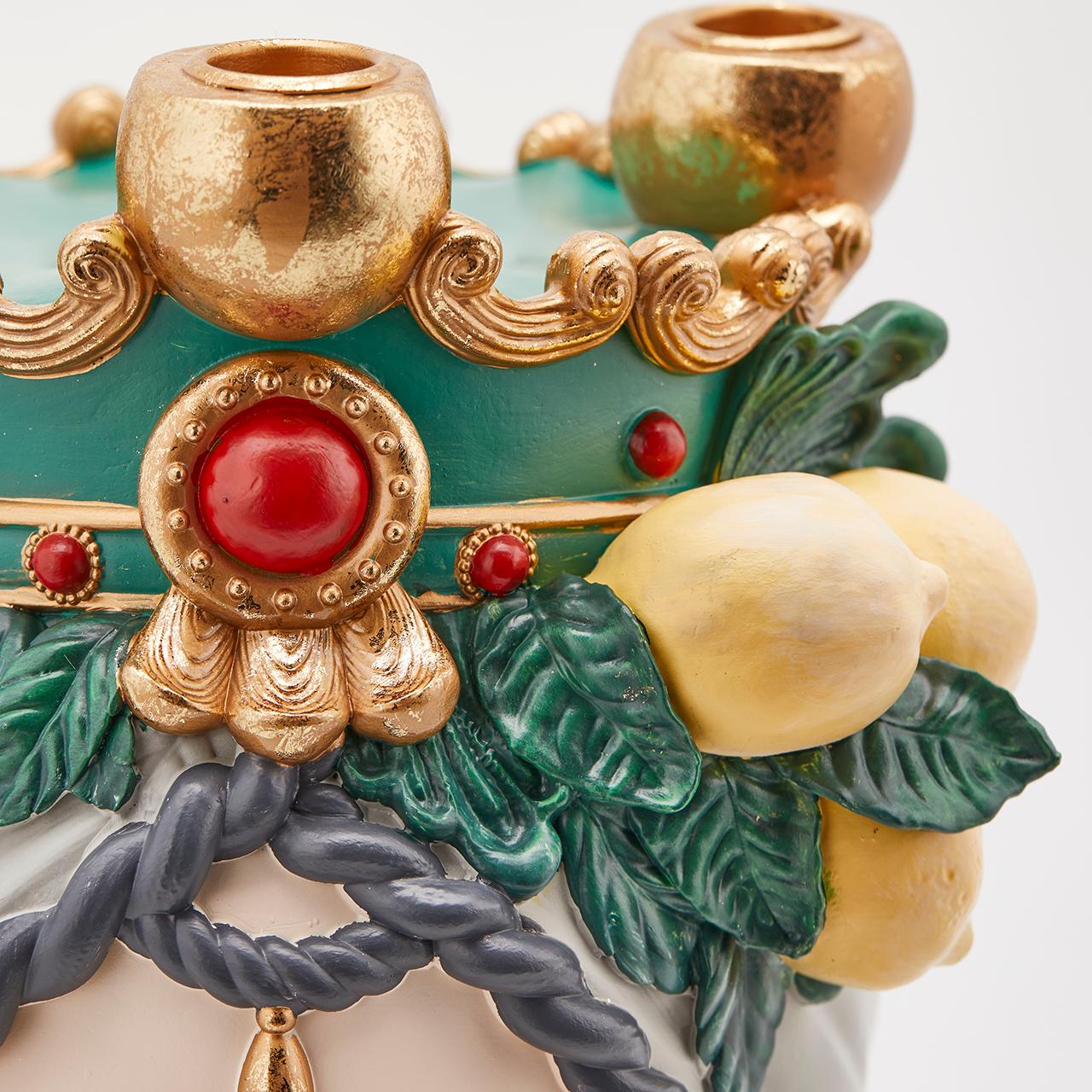 E' Realizzato in resina e dipinto completamente a mano, il candeliere ha un elaborato copricapo sulla sommità del quale troviamo ben 3 alloggi per candele stelo. Perfetto anche come idea regalo home decor.