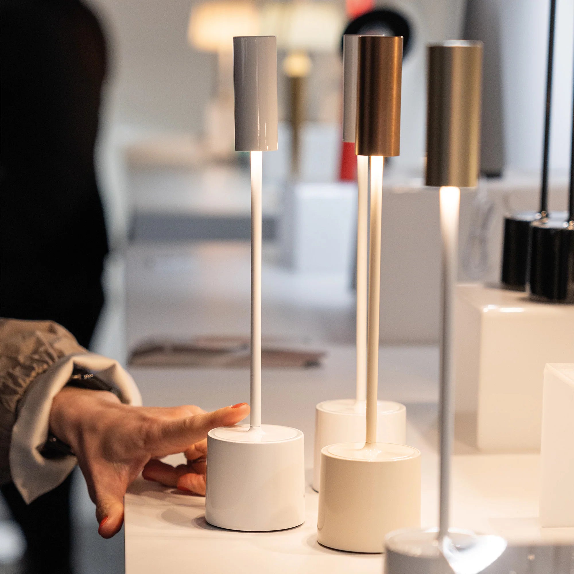Il comando touch sulla base consente di accendere e spegnere la lampada, regolare l’intensità luminosa e selezionare la temperatura di colore della luce (2200K, 2700K, 3000K). Il modulo luce è ricaricabile e sostituibile, con fino a 9 ore di autonomia alla massima potenza e una ricarica completa in circa 3 ore e mezza.