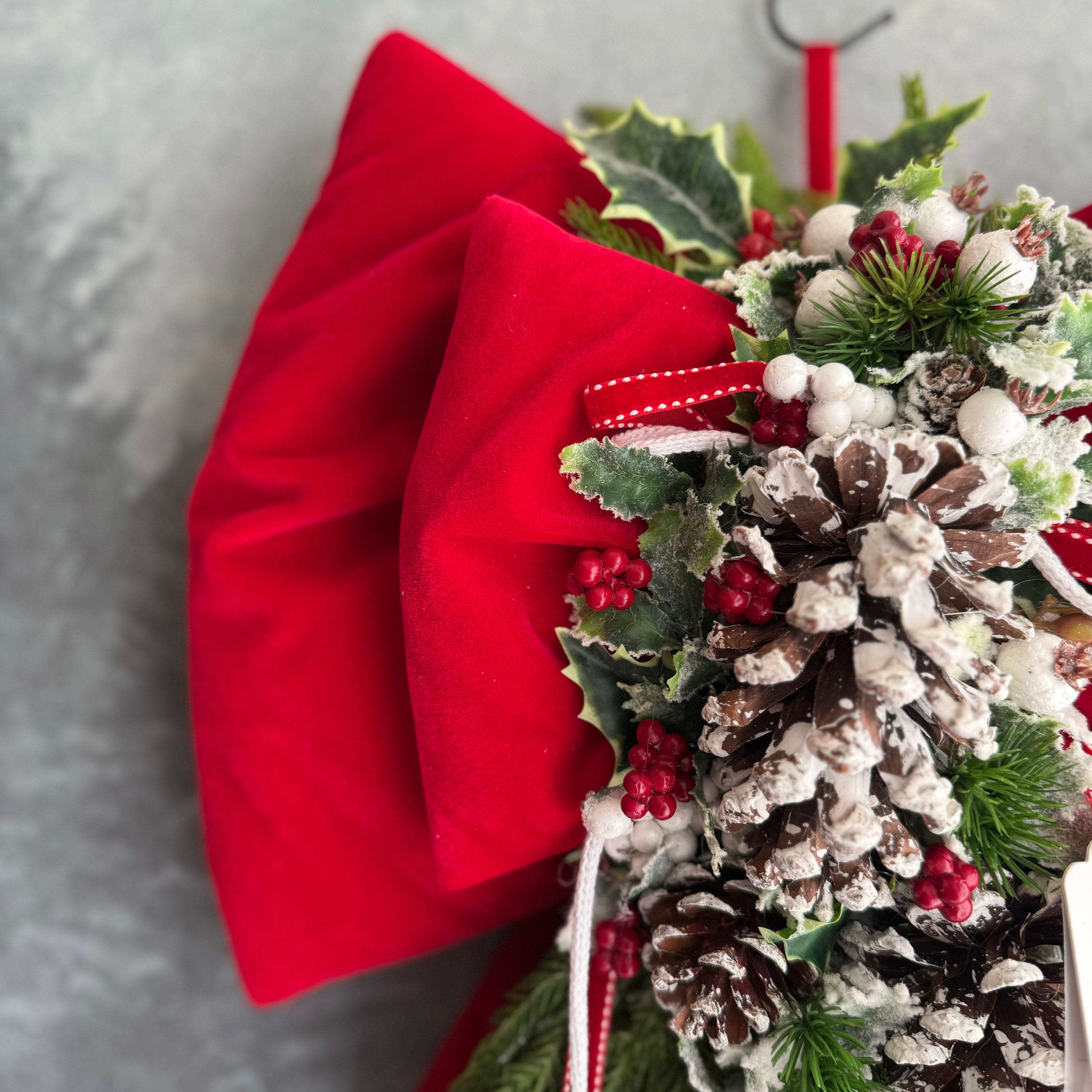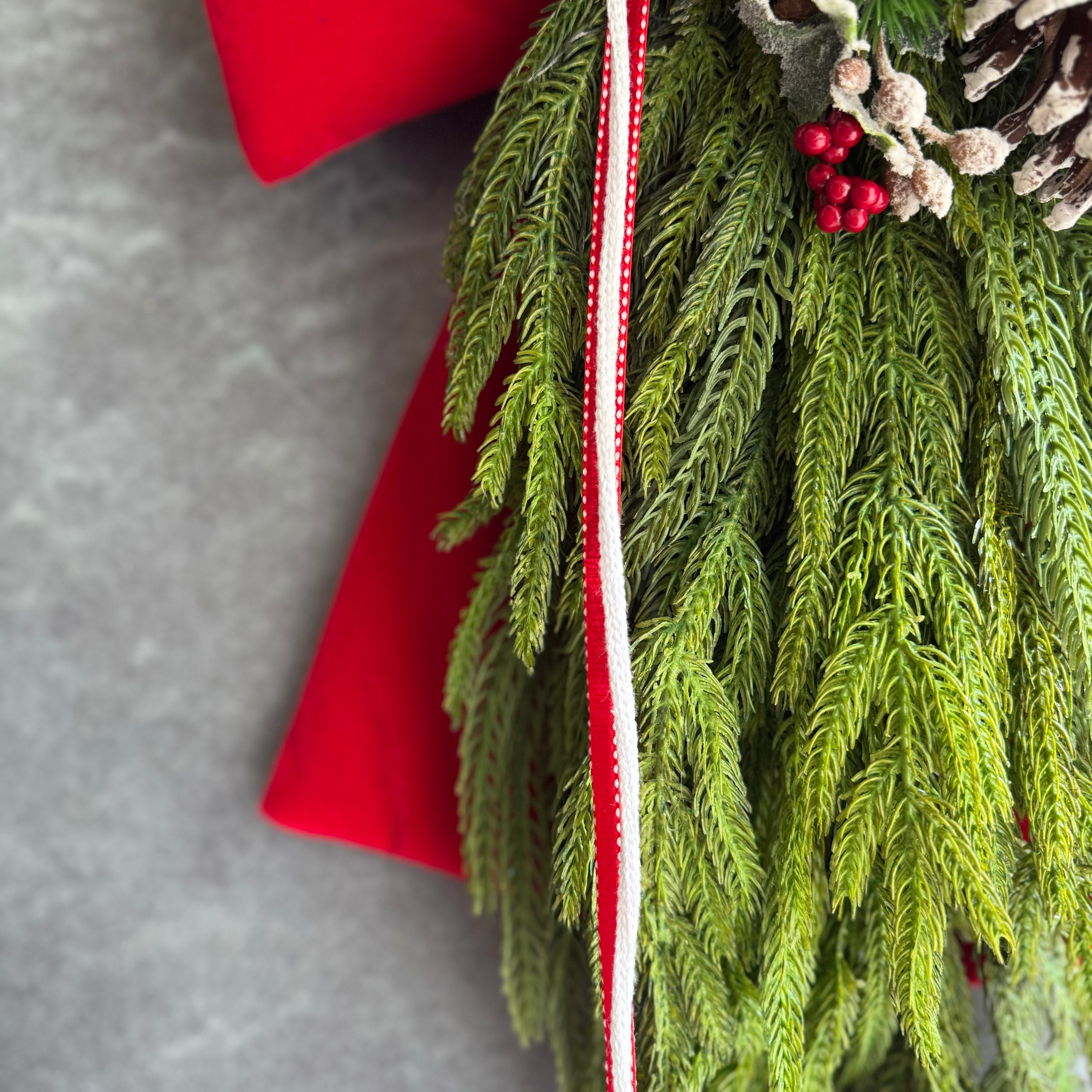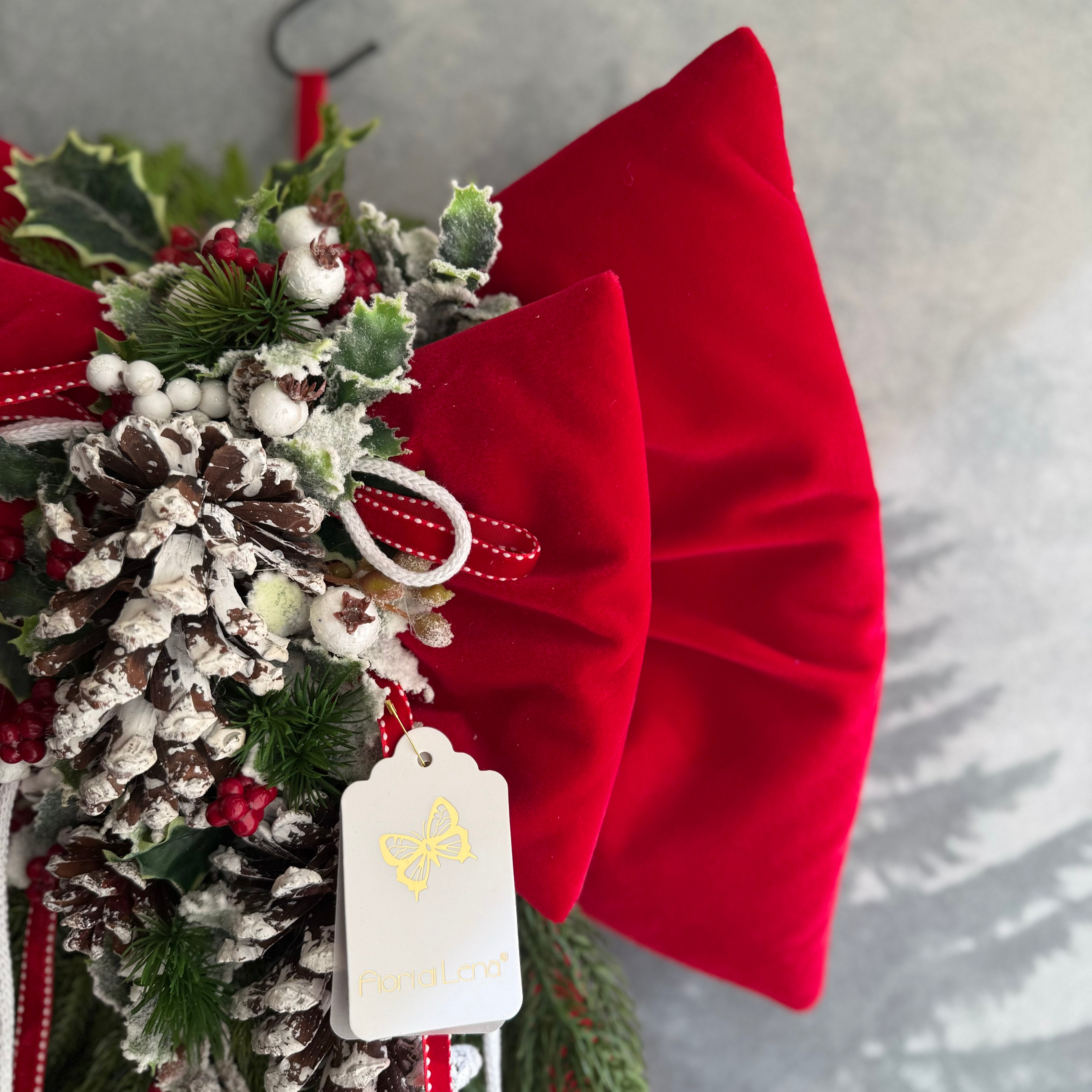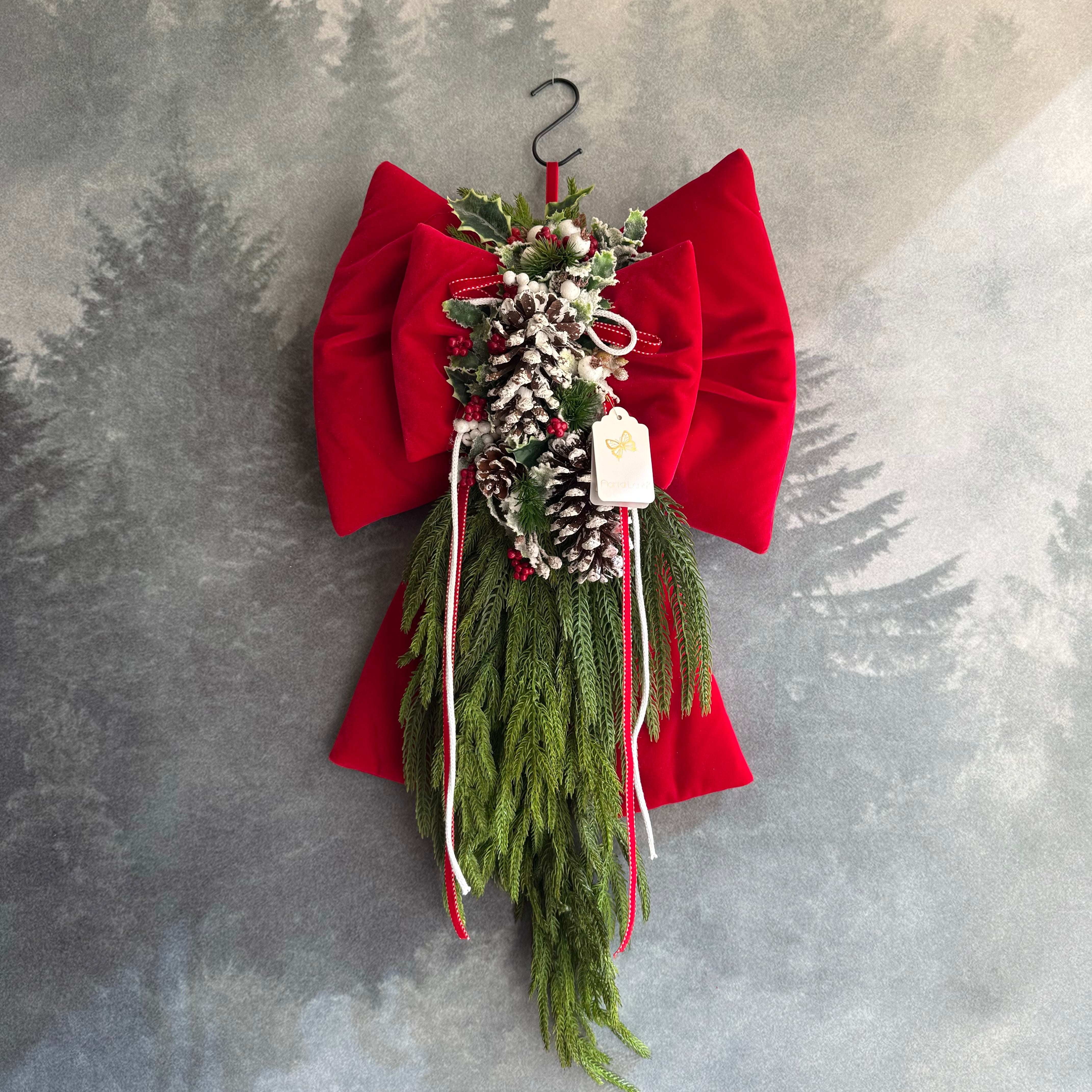 Lasciati avvolgere dalla magia del Natale con il Doppio Fiocco Imbottito con Pino Cadente e Pigne firmato Fiori di Lena: una creazione artigianale di rara eleganza, pensata per impreziosire con stile ogni ambiente durante le festività.