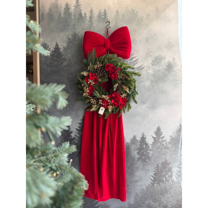 Alto 75 cm, questo raffinato fuoriporta natalizio si distingue per la sua ghirlanda finemente decorata con elementi naturali e dettagli floreali, sapientemente abbinati a un morbido fiocco imbottito in velluto. Il risultato è una composizione armoniosa e scenografica, che richiama l’autenticità e la magia delle atmosfere invernali.