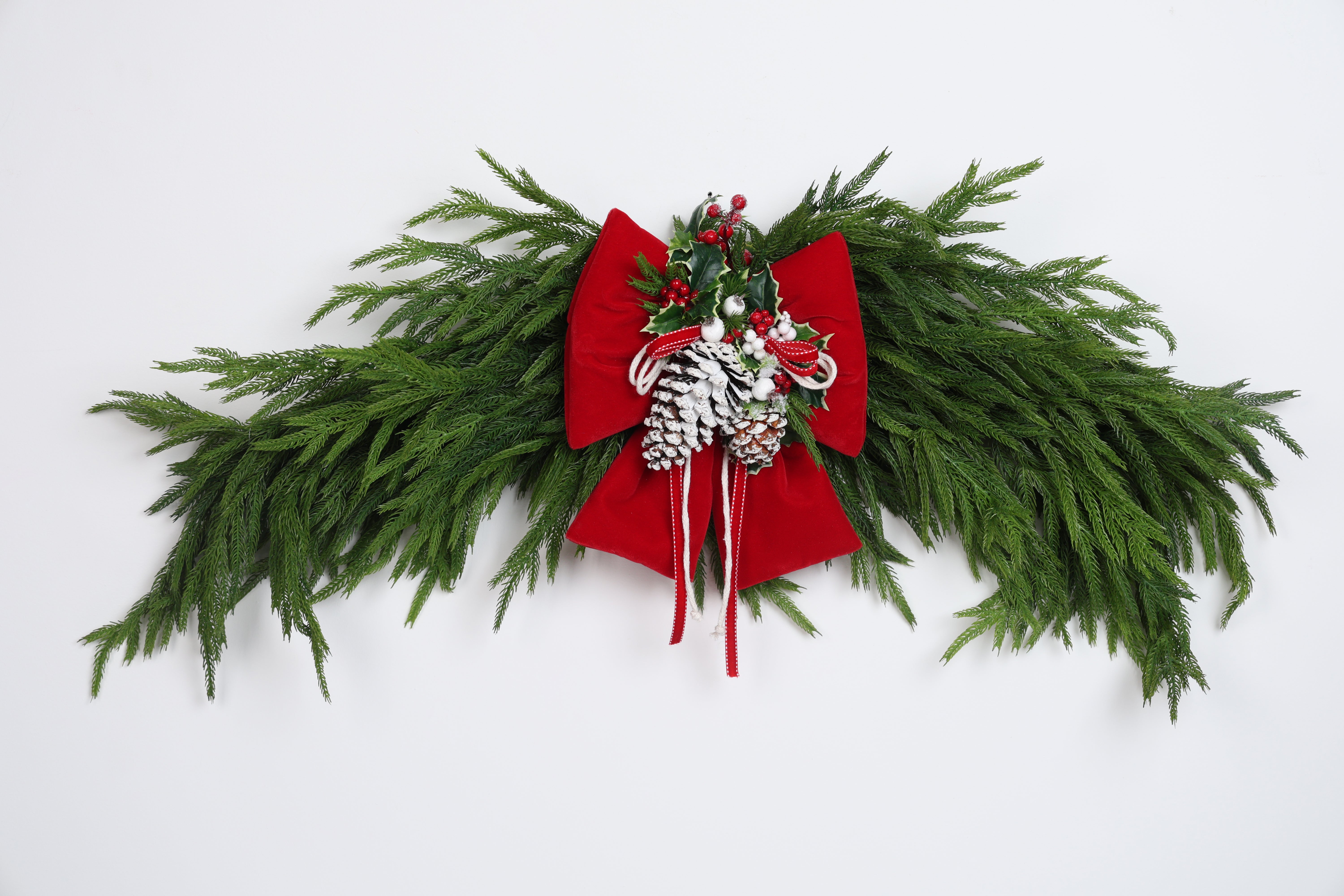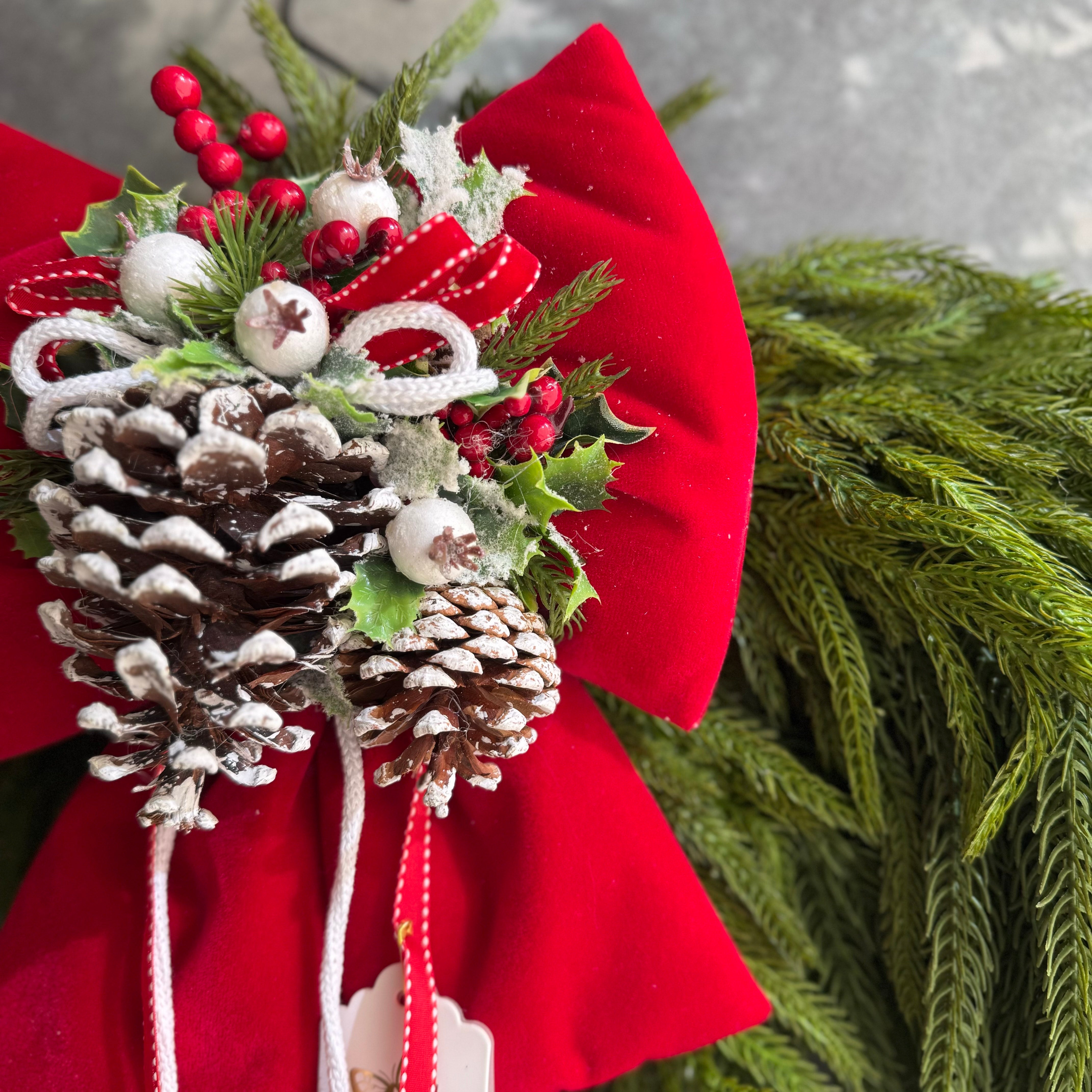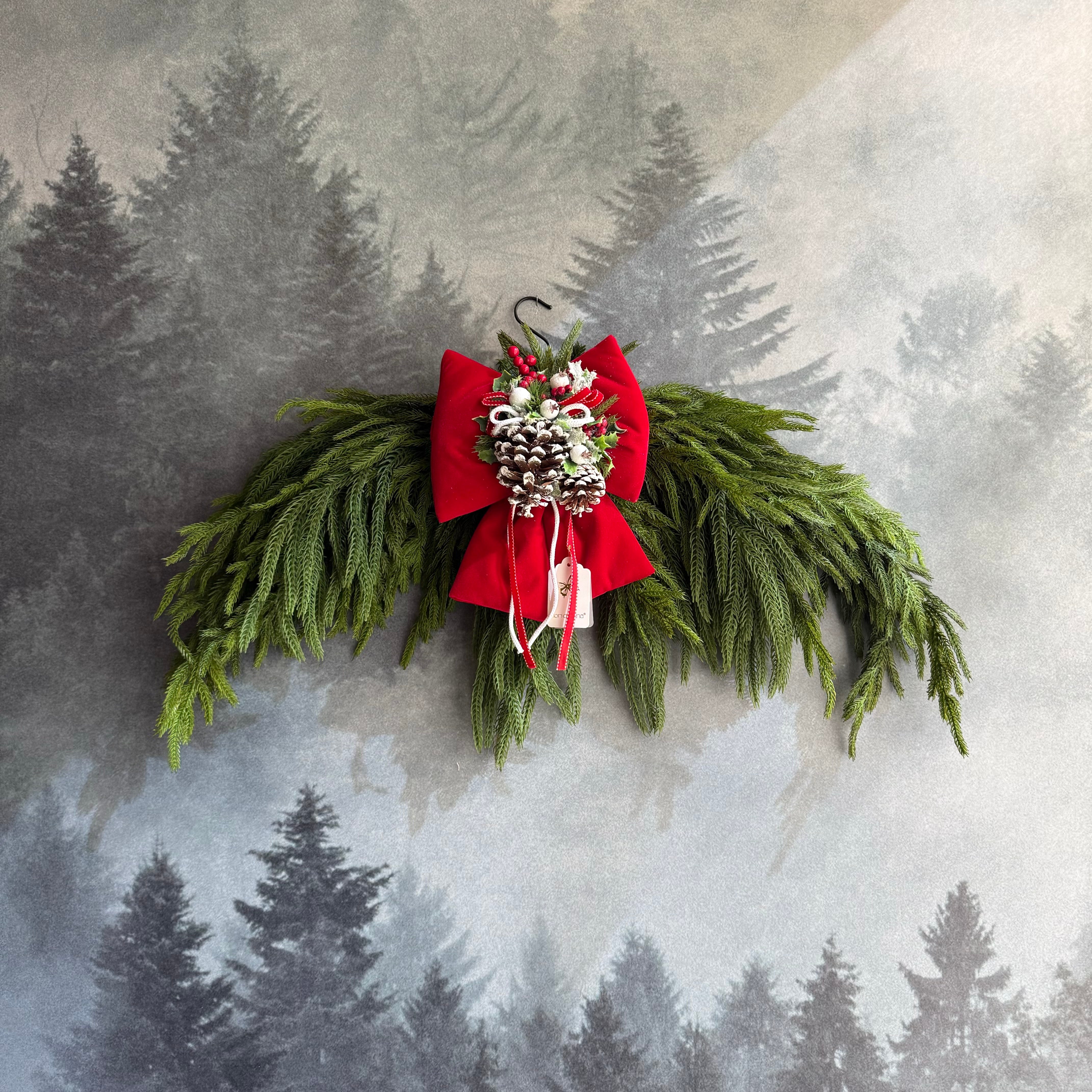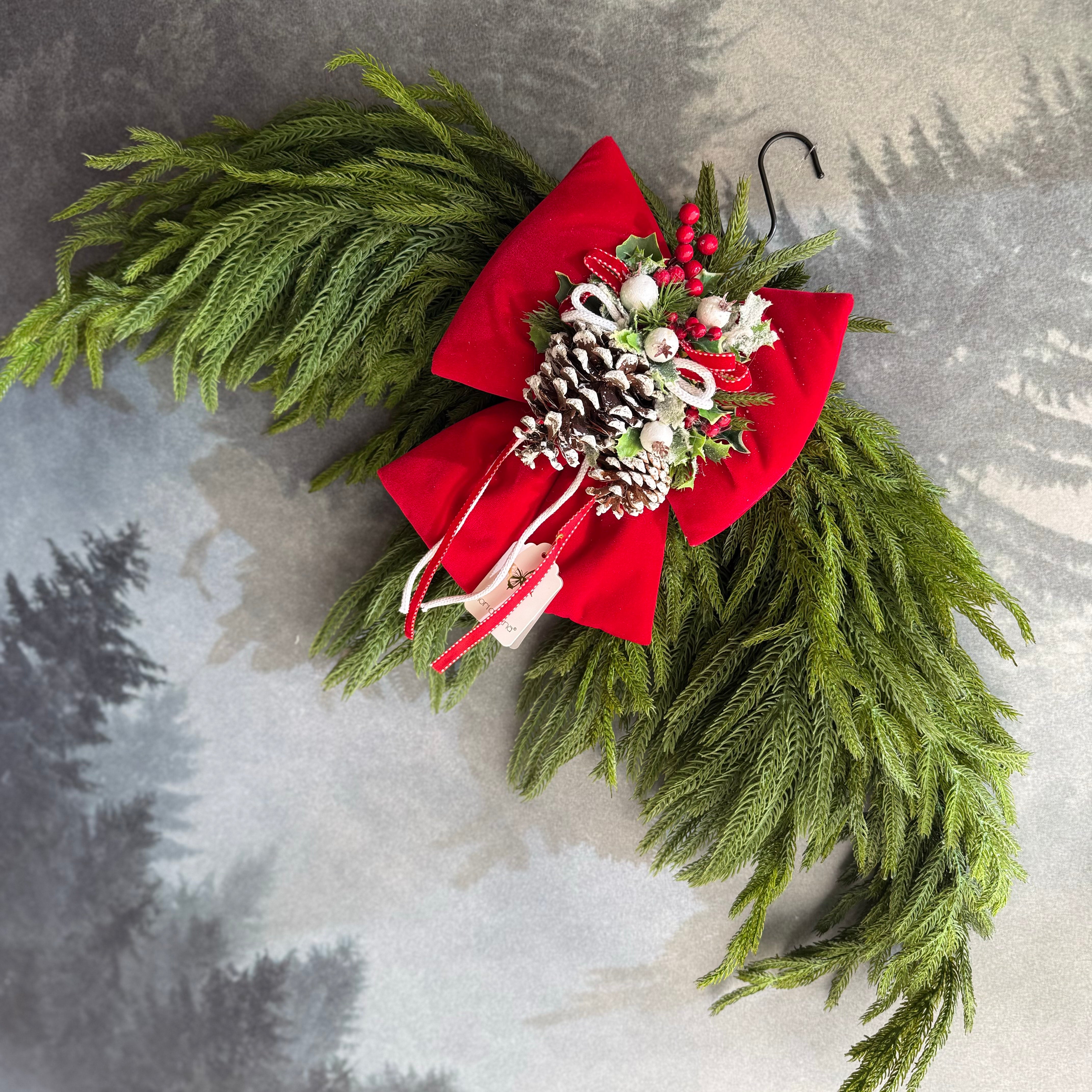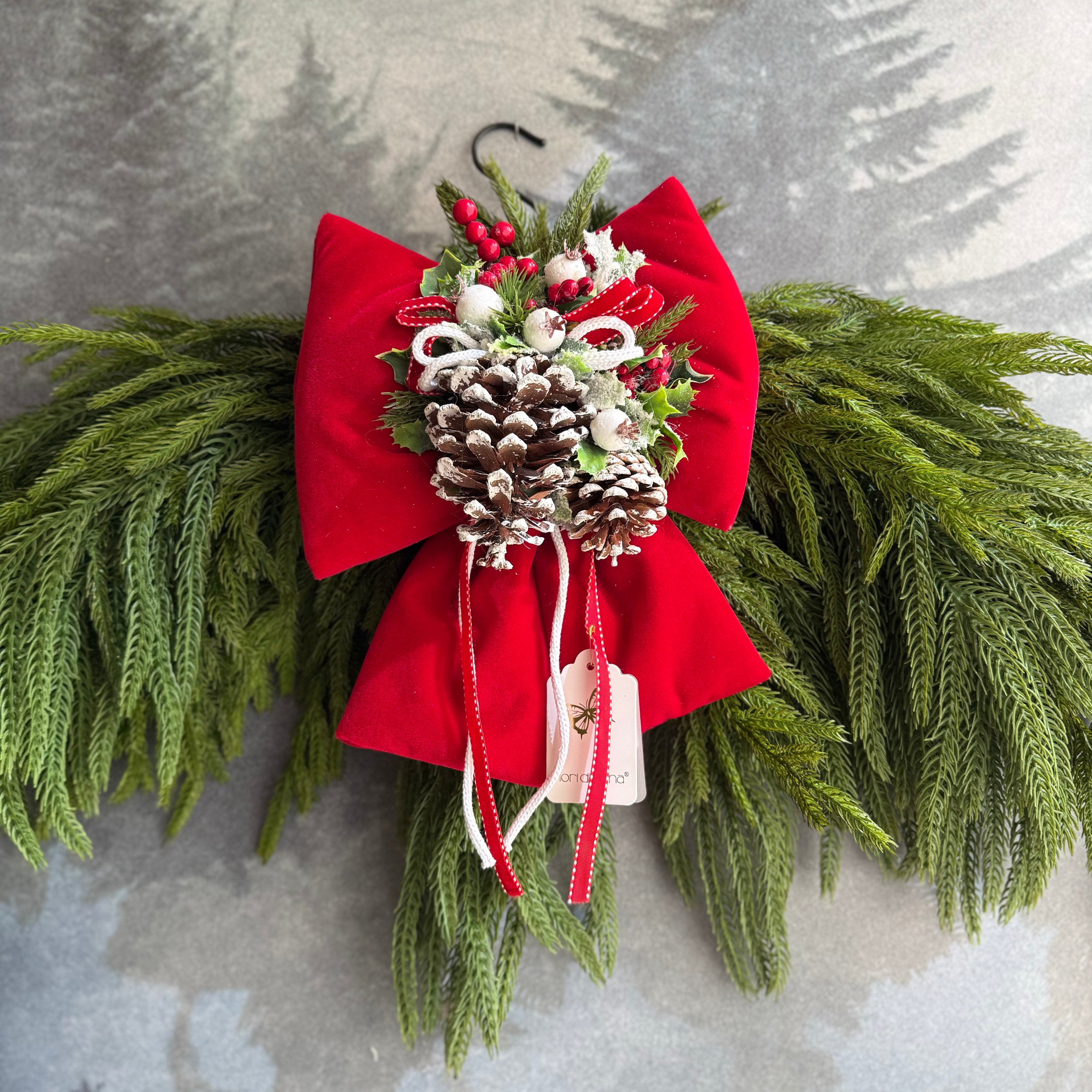 Realizzato a mano in Italia, questo fuoriporta combina sapientemente la struttura ad arco con un ampio fiocco decorativo e la naturale bellezza del pino cadente, per un effetto armonioso e festoso. I dettagli sono curati con estrema attenzione, esprimendo al meglio l’autenticità del lavoro artigianale.