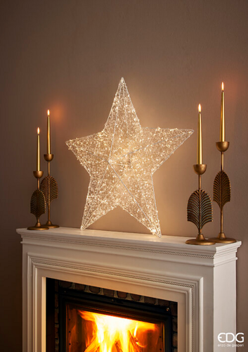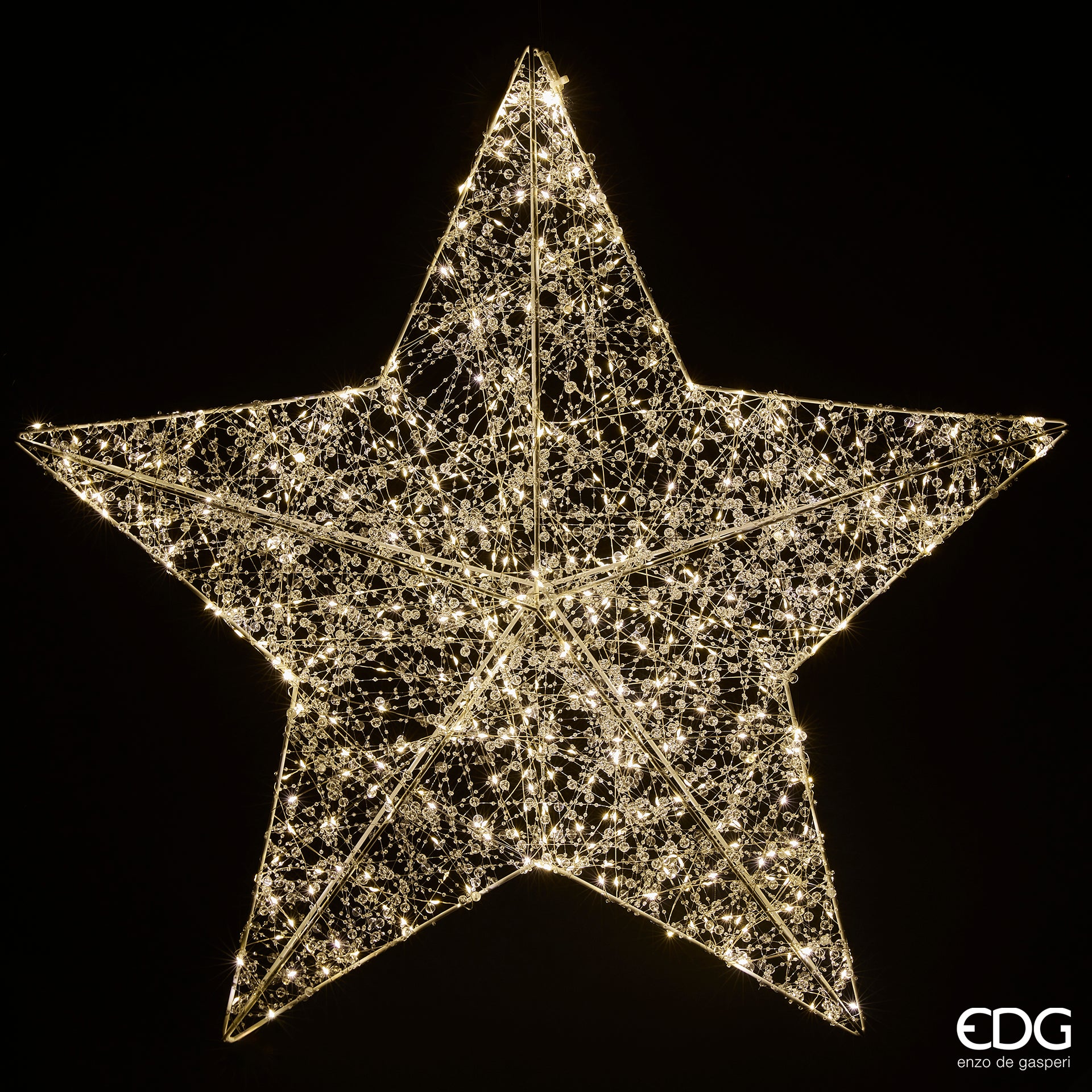 Il Decoro Pearls Stella con 600 microled di Enzo De Gasperi è una soluzione luminosa elegante e di forte impatto visivo, pensata per arricchire ambienti interni ed esterni con uno stile sofisticato e contemporaneo. Realizzata in metallo con finitura EDG Metal, questa stella luminosa ha un diametro di 80 cm e una larghezza di 16 cm, combinando design moderno e artigianalità nella cura dei dettagli. Grazie alle sue luci microled a emissione fissa e al timer integrato che regola automaticamente il ciclo 6 ore ON e 18 ore OFF, offre una decorazione pratica, scenografica e a basso consumo energetico. Funziona a bassa tensione, con alimentazione da 4,5V e assorbimento di soli 6W, ed è dotata di cavo da 5 metri per una facile installazione. Il grado di protezione IP44 garantisce resistenza agli agenti atmosferici, rendendola adatta anche per l’uso esterno. Il prodotto è confezionato in una scatola bianca dal design essenziale, perfetta anche per soluzioni espositive. Il Decoro Pearls Stella è la scelta ideale per chi cerca un elemento decorativo di qualità firmato Enzo De Gasperi, capace di creare atmosfere magiche con semplicità e raffinatezza.