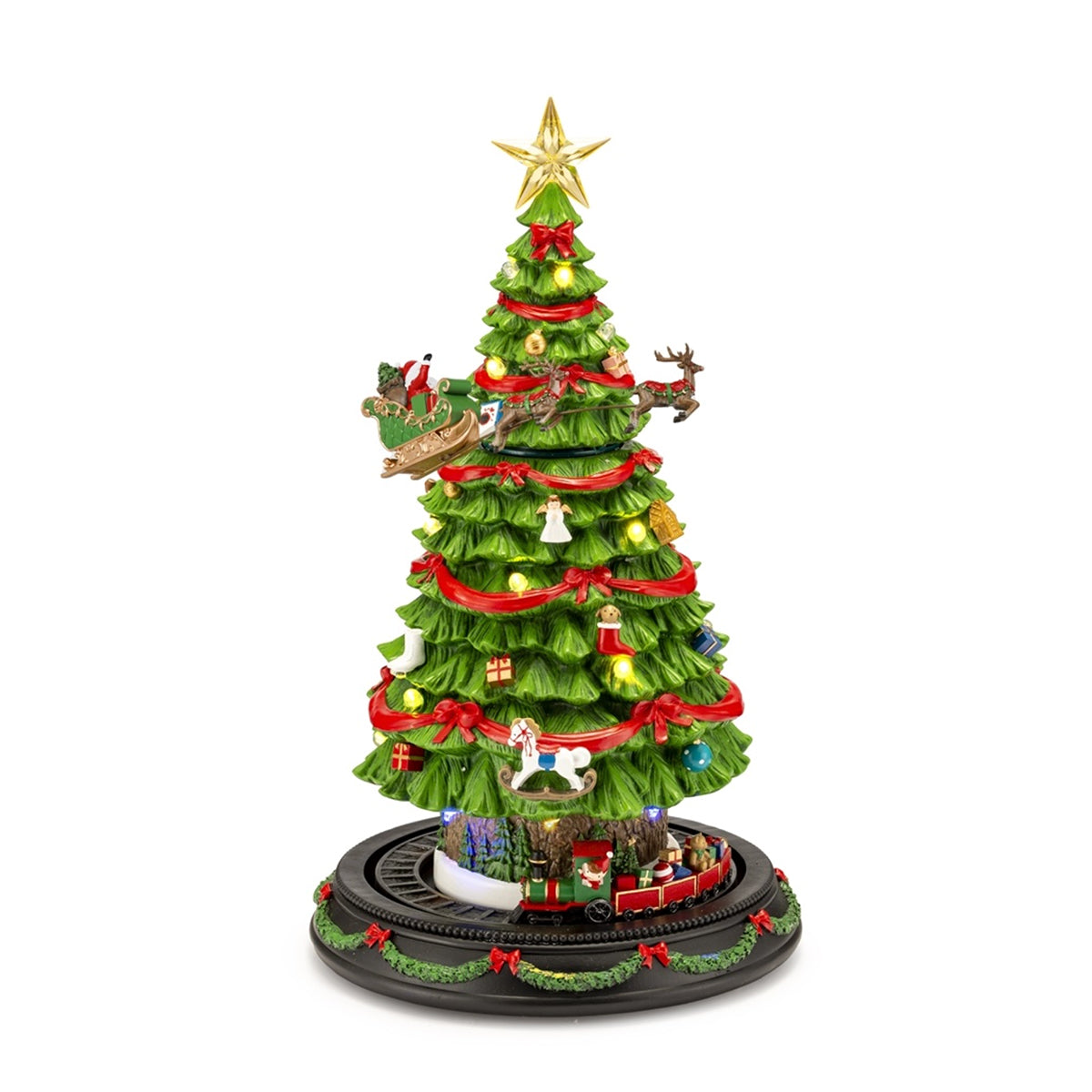 Alto 49 cm, questo albero di Natale decorativo in resina e materiali pregiati è impreziosito da dettagli curati e scene animate che prendono vita al suono delle melodie natalizie. Le luci calde e soffuse illuminano i personaggi e le decorazioni, rendendolo il centro perfetto per camini, consolle o vetrine natalizie.