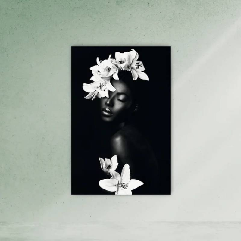 Il soggetto raffigura il movimento armonioso di una donna, avvolta da delicati fiori bianchi, in contrasto con un profondo sfondo nero, creando un impatto visivo sofisticato e ricercato. I colori brillanti e resistenti ai raggi UV garantiscono una lunga durata nel tempo, mantenendo inalterata la qualità estetica.