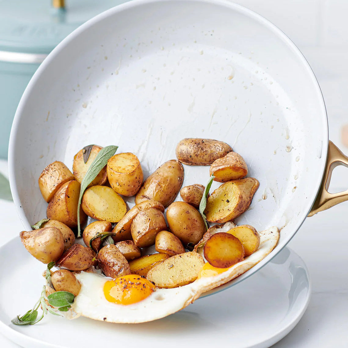 Queste padelle hanno un fondo spesso in alluminio forgiato e un manico robusto in acciaio inossidabile con rivestimento protettivo in PVD oro. Questa gamma è dotata di un avanzato rivestimento antiaderente in ceramica Thermolon che garantisce risultati perfetti con meno olio o burro ed è completamente privo di PFAS. Cucinare in modo sano è facile.