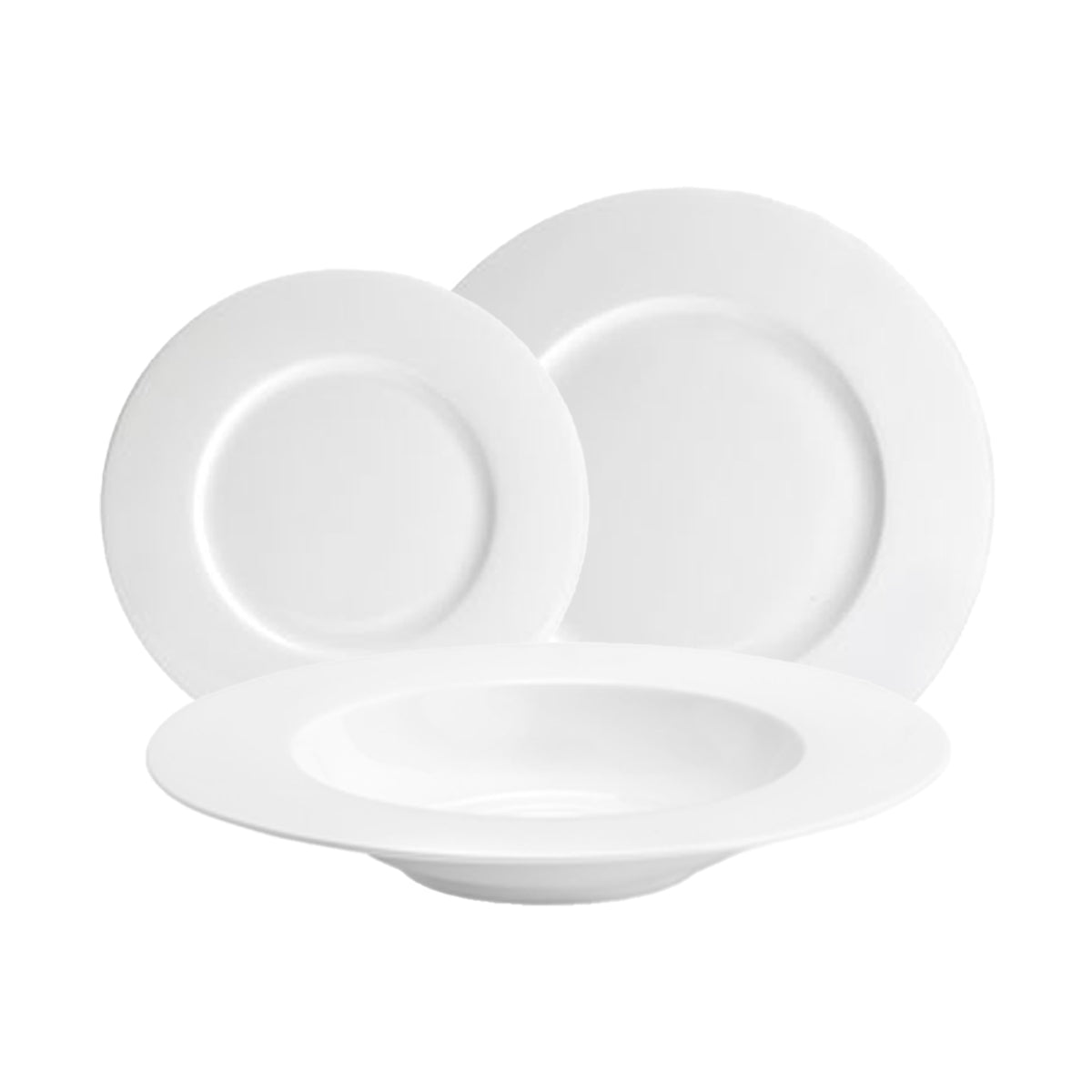 Il decoro sobrio e sofisticato rende questo servizio adatto sia all’uso quotidiano che alle occasioni speciali. Composto da: 6 piatti fondi D23 cm, 6 piatti piani D27 cm e 6 piatti frutta D21 cm.