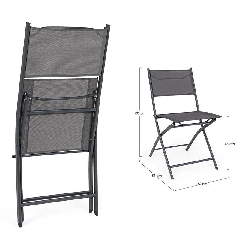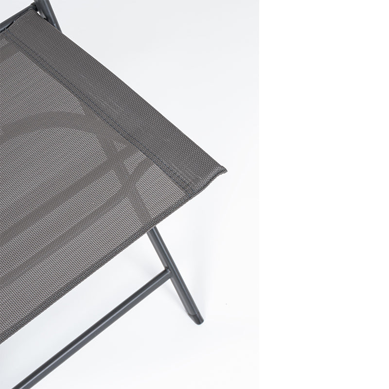 La seduta e lo schienale sono realizzati in textilene 2x1 ad alta densità (540g/m²), un materiale tecnico resistente, traspirante e confortevole, perfetto per affrontare il sole e l’umidità senza perdere la propria forma. La finitura antracite dona alla sedia un look sobrio e moderno, facilmente abbinabile ad altri arredi da esterno.