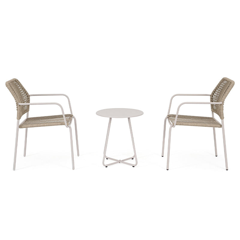 Il Set Bistrot Jable color sabbia di Andrea Bizzotto è una soluzione elegante e funzionale per arredare con gusto balconi, terrazze, giardini e verande. Pensato per chi desidera un set da esterno compatto ma di grande impatto estetico, è composto da due sedie impilabili e un tavolino rotondo dal diametro di 45 cm, ideale per creare un angolo colazione o relax per due persone.