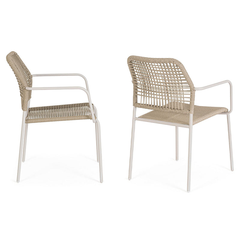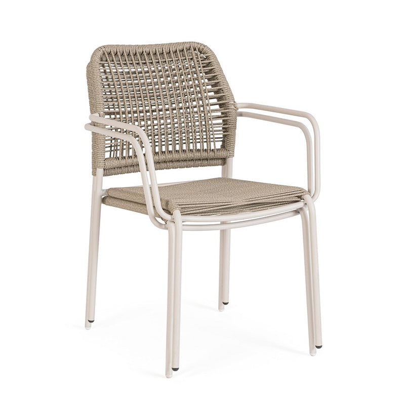 La struttura è realizzata in acciaio trattato per esterno con sistema e-coating e successivamente verniciato a polvere poliestere, una combinazione che garantisce elevata resistenza alla ruggine, agli agenti atmosferici e all’usura nel tempo. L’intreccio in fibra sintetica twisted dona un effetto naturale e contemporaneo, assicurando allo stesso tempo praticità, leggerezza e facilità di manutenzione. Il colore sabbia, neutro e raffinato, si integra armoniosamente in contesti moderni, mediterranei o più classici, valorizzando qualsiasi spazio outdoor.