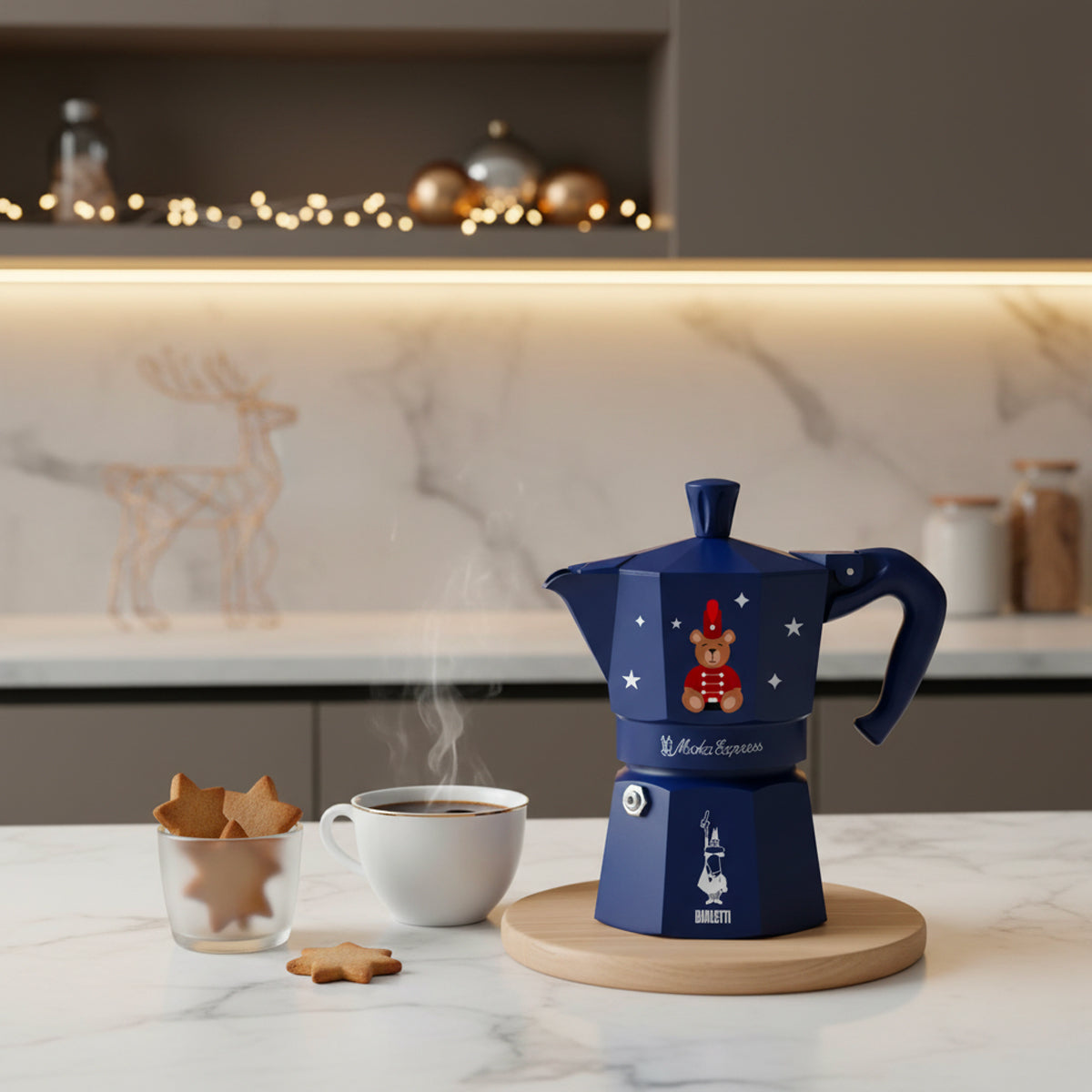 Realizzata in alluminio di qualità, questa moka da 3 tazza garantisce un caffè cremoso e aromatico in pochi minuti. Il design festivo blu la rende perfetta come regalo natalizio per gli amanti del caffè espresso.