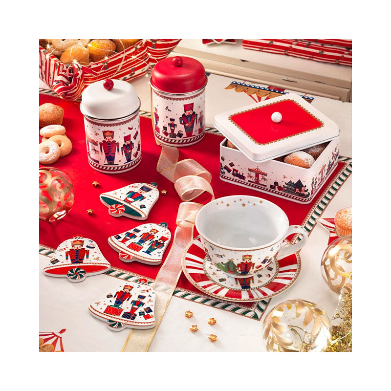 Il raffinato decoro natalizio “Lo Schiaccianoci” riproduce i celebri personaggi del balletto più amato del periodo invernale, portando sulla tavola un’atmosfera fiabesca e festosa. I dettagli dorati e le tonalità calde rendono questa tazza Brandani un piccolo capolavoro di stile, perfetta per accompagnare tè, caffè, latte o cioccolata calda.
