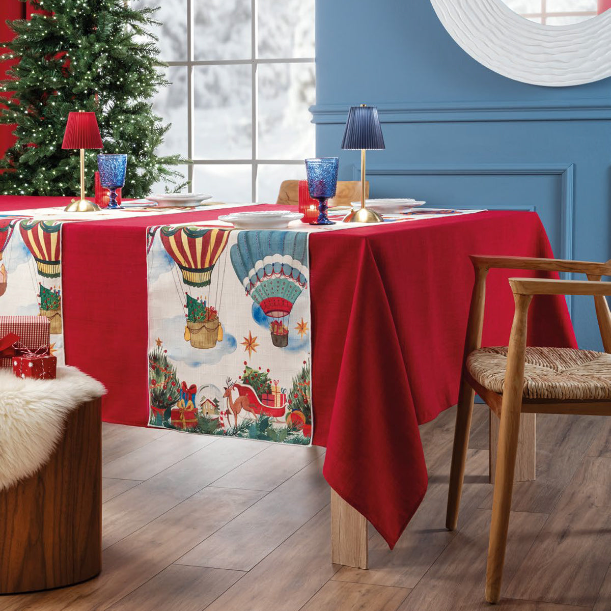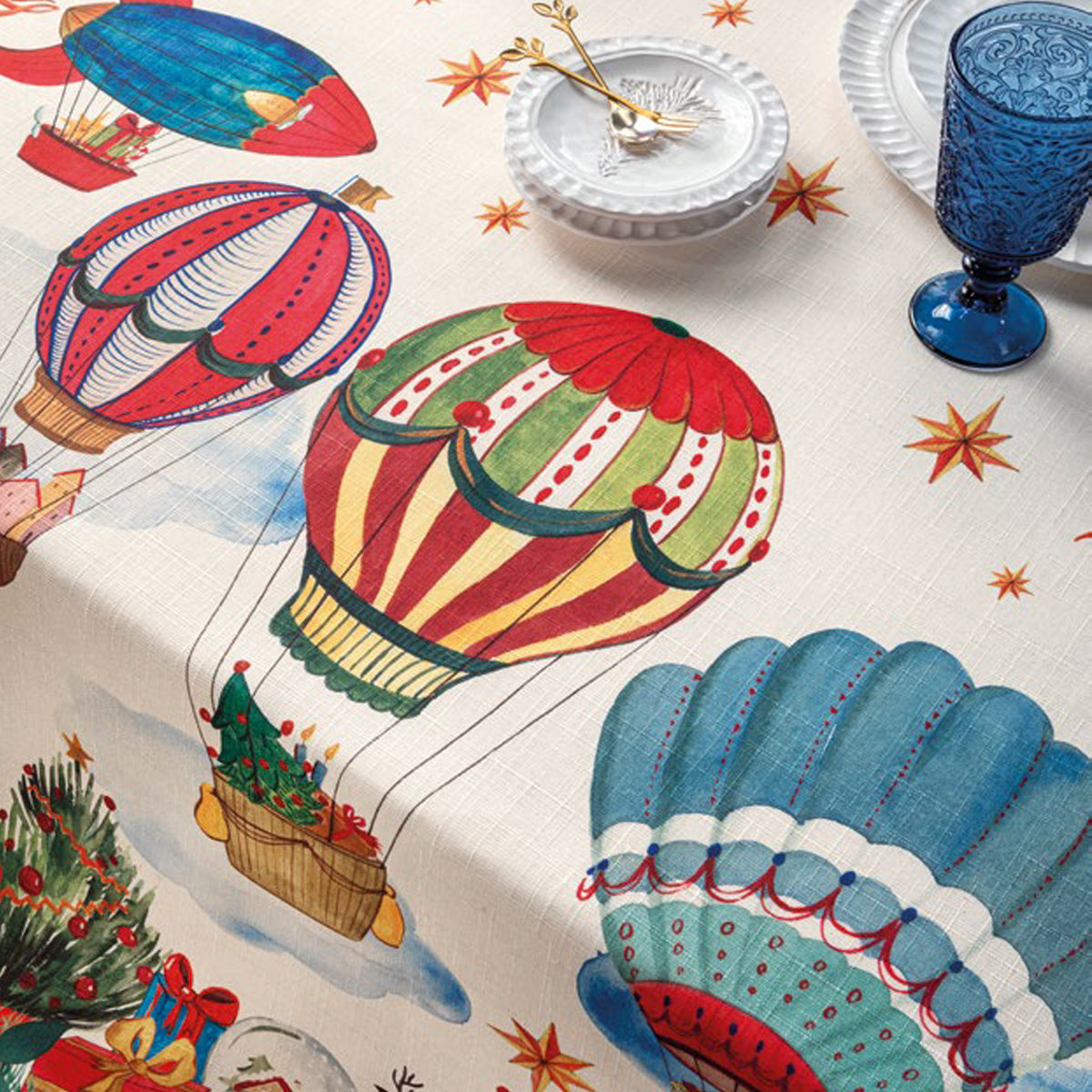 La tovaglia natalizia Mongolfiere de L’Oca Nera è un accessorio elegante e pratico che unisce stile e funzionalità. Realizzata in tessuto antimacchia, protegge il tavolo e garantisce la massima facilità di pulizia, senza rinunciare al design. Il delicato motivo con mongolfiere natalizie dona alla mise en place un tocco originale e festoso.