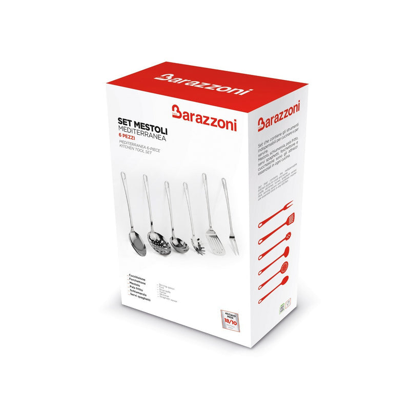 Il set di utensili da cucina Barazzoni in acciaio inox 18/10 comprende gli strumenti indispensabili per cucinare e servire con praticità ed eleganza, rappresentando una dotazione essenziale per ogni cucina.