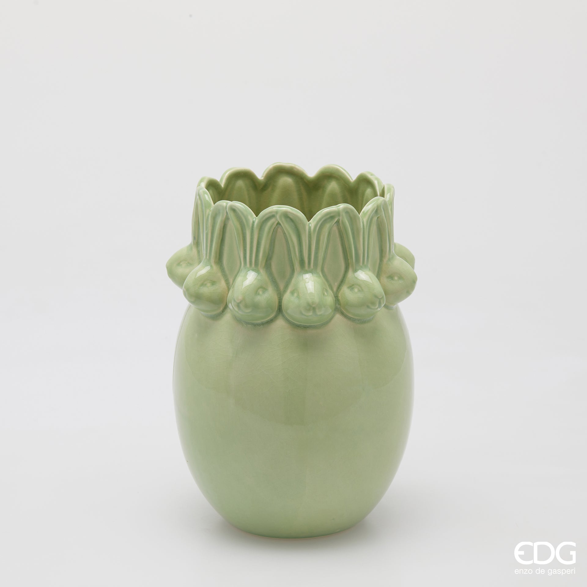 EDG Enzo De Gasperi Vaso Conigli Easter Bombato H24 cm Verde è un’elegante decorazione pasquale in vetro caratterizzata da un design originale e raffinato, perfetta per dare un tocco di stile e colore agli spazi della casa durante la stagione primaverile. Firmato EDG Enzo De Gasperi, questo vaso combina estetica contemporanea e qualità dei materiali, rendendolo un elemento d’arredo decorativo di grande impatto.