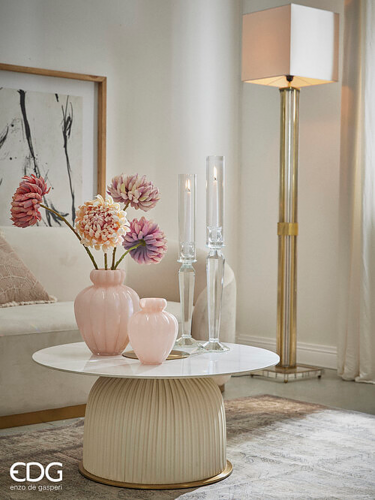 Raffinato e scenografico, il vaso “Chignon” in vetro rosa di EDG Enzo De Gasperi è un complemento d’arredo dal forte impatto visivo. Alto 20 cm, si distingue per la sua forma tondeggiante ed elegante, ispirata al raccolto di un chignon, con linee fluide e una superficie liscia e luminosa che valorizza ogni ambiente.