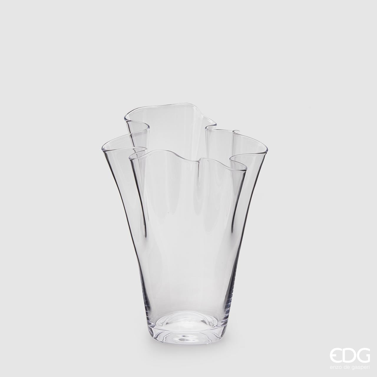 Vaso Drappo della nuova collezione dell'azienda EDG Enzo De Gasperi, realizzato interamente in vetro di ottima qualità, ha un'altezza di ben 29 centimetri ed ha un diametro di 23 cm. Questo vaso è stato modellato e tagliato completamente a mano da maestri artigiani del vetro e grazie al suo spessore risulta essere molto resistente e duraturo nel tempo. Ideale come vaso portafiori o anche semplicemente come vaso centrotavola.