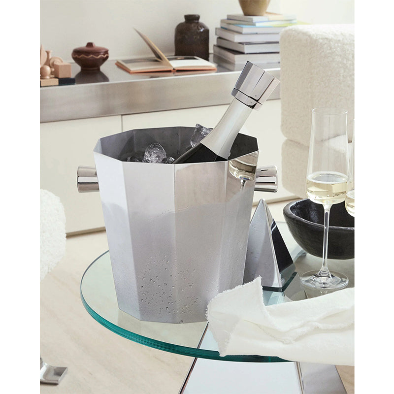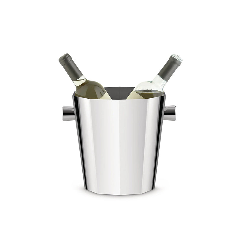 Der Weinkühler Eugenia interpretiert die Kunst des Weinservierens mit raffinierter Schlichtheit. Seine zehneckige Form verleiht ihm eine skulpturale und zugleich funktionale Dimension. Die konischen Griffe an den Seiten sorgen für sicheren Halt und bequemes Tragen, ohne das strenge Design zu beeinträchtigen. Er bietet Platz für eine Flasche Champagner oder zwei Flaschen Wein und erfüllt damit die Bedürfnisse moderner Gastronomie, bei der Vielfalt und Flexibilität zum Genuss dazugehören.