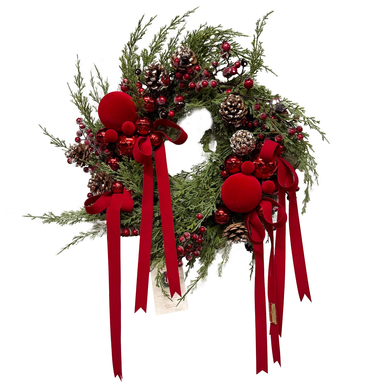 Der Weihnachtskranz „Christmas Reflections“ von Madame Fioccò mit 40 cm Durchmesser ist eine elegante und raffinierte handgefertigte Dekoration, die Türen, Eingänge und Innenräume während der Feiertage verschönert. Er ist aus edlen Stoffen und Samtdetails handgefertigt und mit Beeren, Tannenzapfen, Bändern und Lichtapplikationen verziert, die den ganzen Zauber von Weihnachten heraufbeschwören.