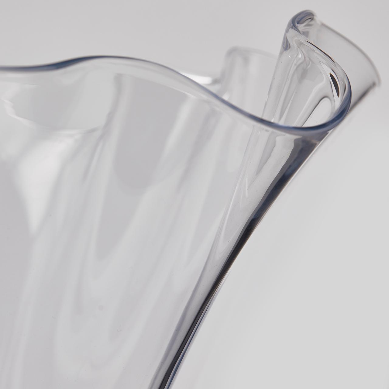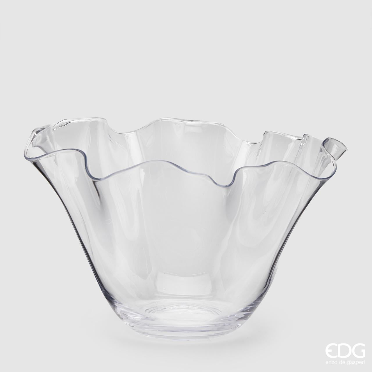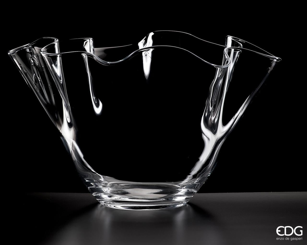 Vaso Drappo della nuova collezione dell'azienda EDG Enzo De Gasperi, realizzato interamente in vetro di ottima qualità, ha un'altezza di 28 centimetri ed ha un diametro di 44 cm. Questo vaso è stato modellato e tagliato completamente a mano da maestri artigiani del vetro e grazie al suo spessore risulta essere molto resistente e duraturo nel tempo. Ideale come vaso portafiori o anche semplicemente come vaso centrotavola.