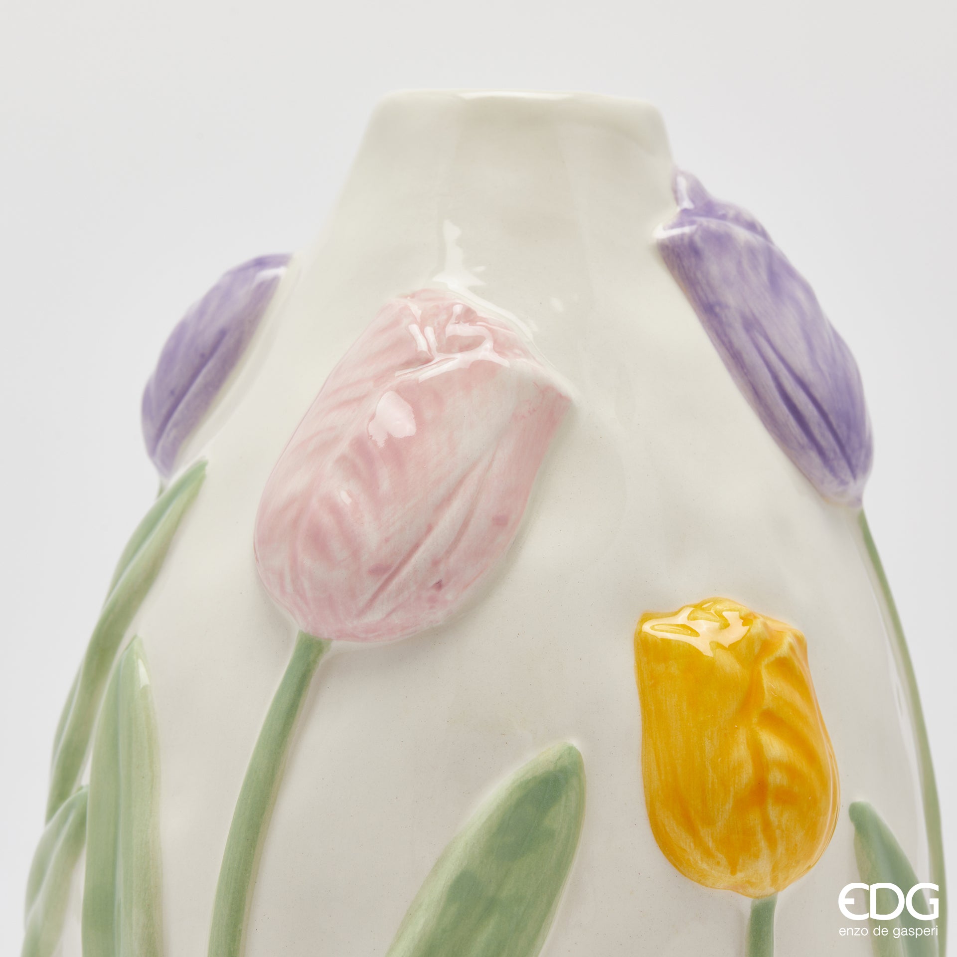 EDG Enzo de Gasperi Vaso Tulipani Ovale H12,5 cm D11 cm in Ceramica è un raffinato complemento d’arredo ideale per donare un tocco primaverile ed elegante agli ambienti. Firmato dal prestigioso brand italiano EDG Enzo De Gasperi, questo vaso si distingue per il suo design ovale impreziosito da una delicata decorazione a tulipani in rilievo.