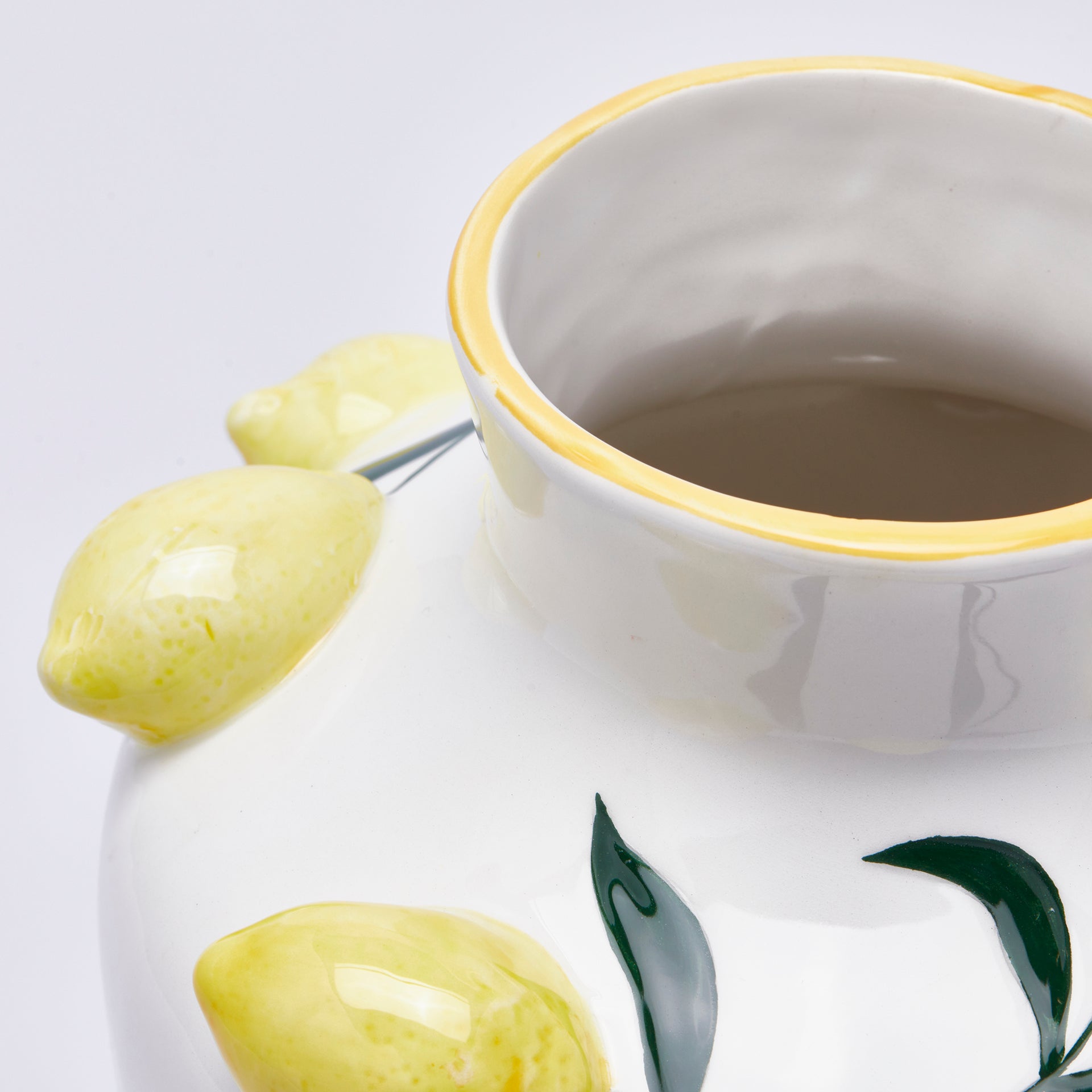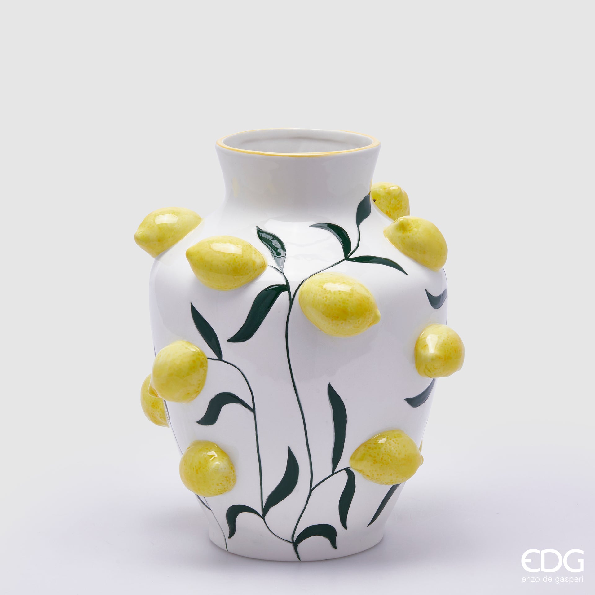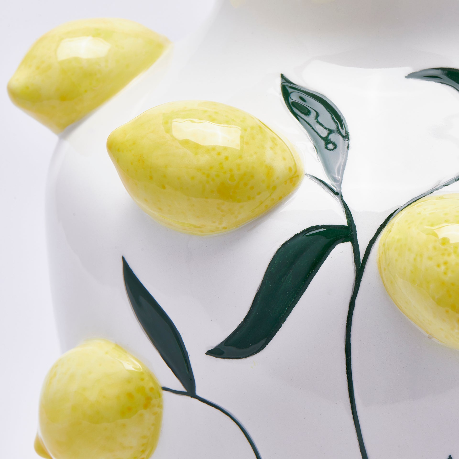 Die Keramikvase mit geprägten Zitronen von EDG Enzo De Gasperi ist ein raffiniertes Einrichtungsaccessoire, das an die Eleganz und Frische der mediterranen Tradition erinnert. Diese Vase aus wasserfester Keramik ist für den Innenbereich konzipiert und besticht durch ihr lebendiges und originelles Design mit dreidimensionalen Zitronen auf der Oberfläche und sorgfältig handgemalten Blättern.