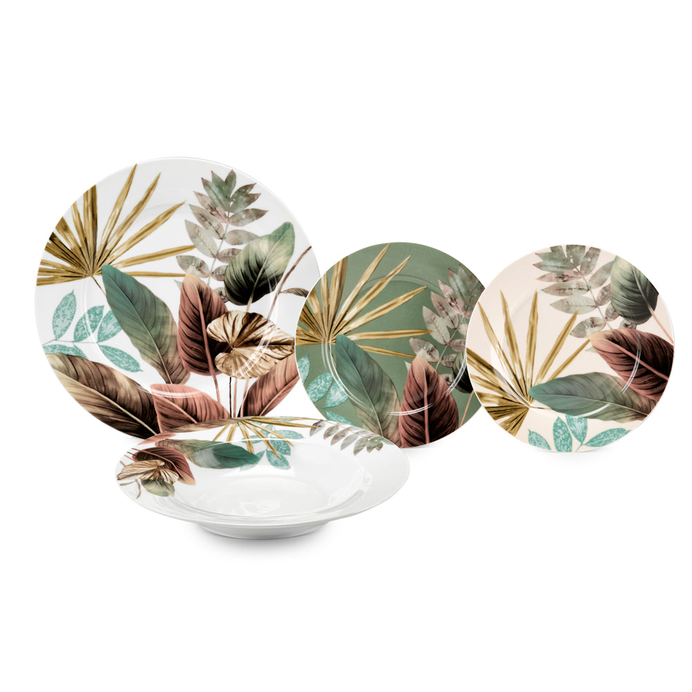Das Service besteht aus: 6 Speisetellern, 6 Suppentellern und 6 Desserttellern.