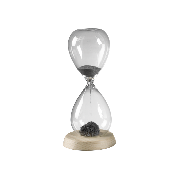 Sie besteht aus transparentem Glas und enthält magnetischen Sand, der, sobald die Sanduhr umgedreht wird, vom Magneten im Sockel aus Buchenholz angezogen wird und so faszinierende und einzigartige Formationen entstehen lässt, die jedes Mal anders aussehen.