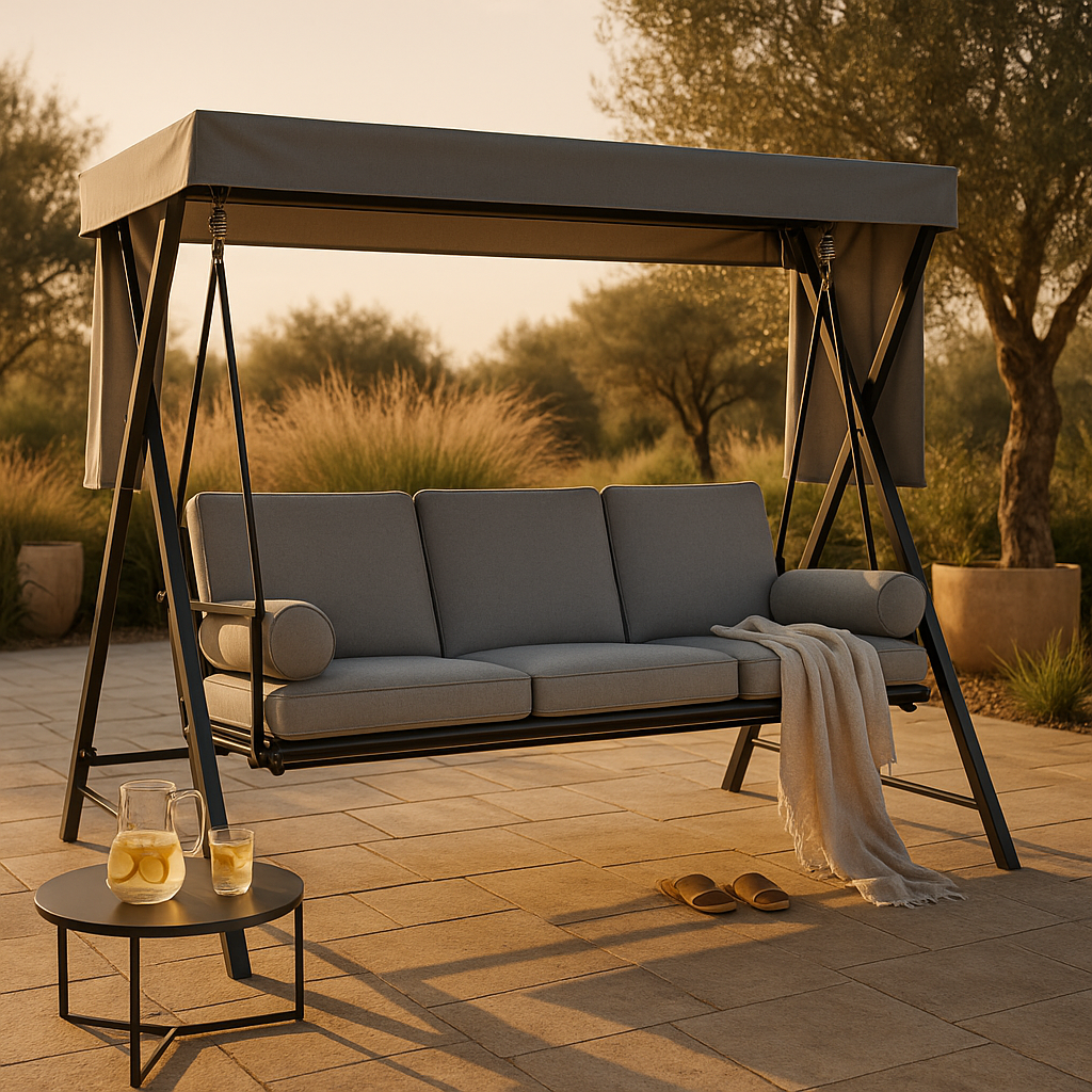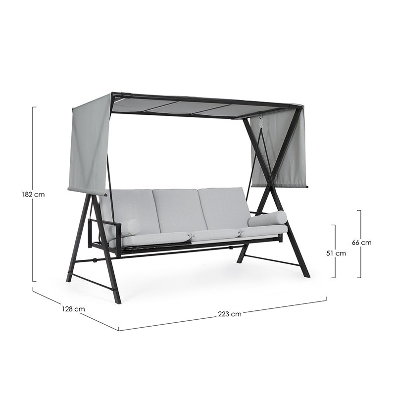 Die Bizzotto 3-Sitzer-Schaukel ist die perfekte Lösung zum Entspannen im Freien. Mit ihrem eleganten und funktionalen Design vereint sie Komfort, Vielseitigkeit und Langlebigkeit und ist somit ideal für Gärten, Terrassen und Veranden. Der Rahmen besteht aus phosphatiertem Stahl und ist für den Außenbereich mit Polyesterpulverbeschichtung versehen. Dies bietet hervorragenden Wetterschutz und sorgt für lange Haltbarkeit. Die Hauptstangen messen 60 x 28 mm und die Rohrabschnitte haben einen Durchmesser von 28 mm, was für hervorragende Stabilität während des Gebrauchs sorgt.