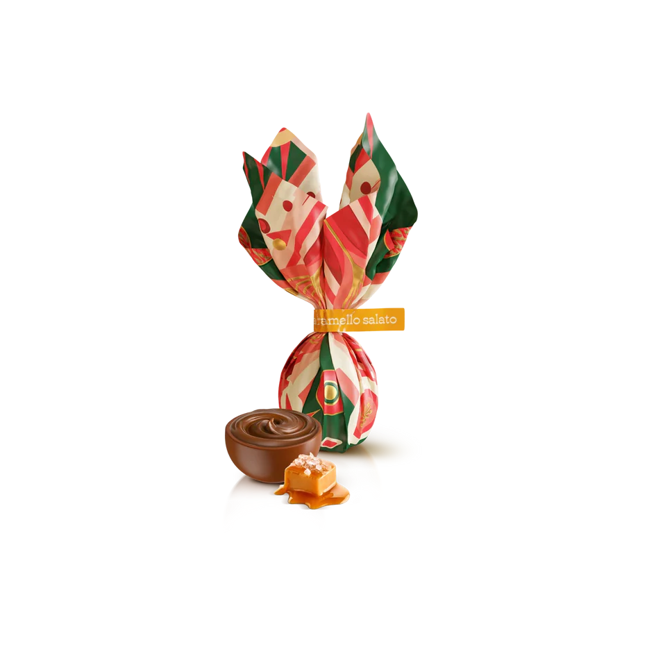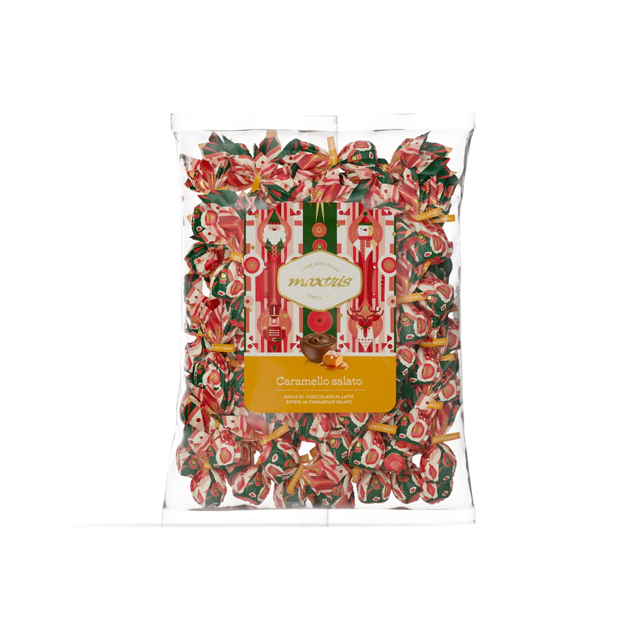 Eingehüllt in eine elegante Schleife und rotes Weihnachtspapier, besteht diese Köstlichkeit aus einer Hülle aus Milchschokolade und einer weichen Milchschokoladenfüllung mit Karamell- und Salzgeschmack.