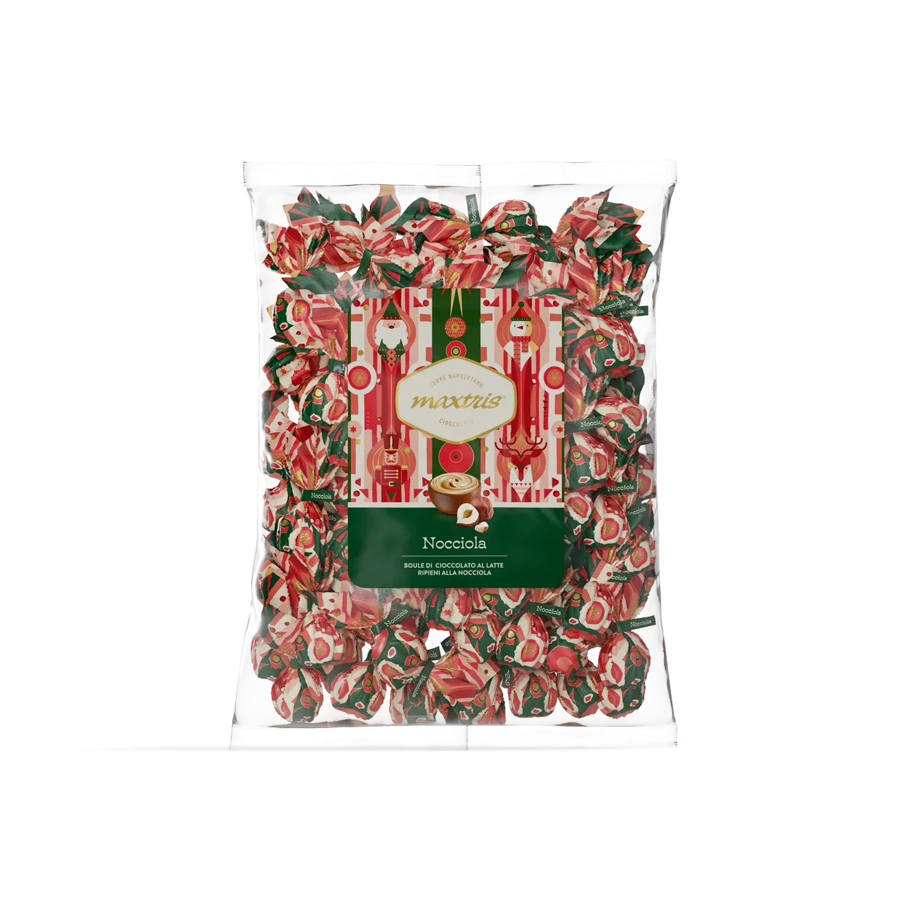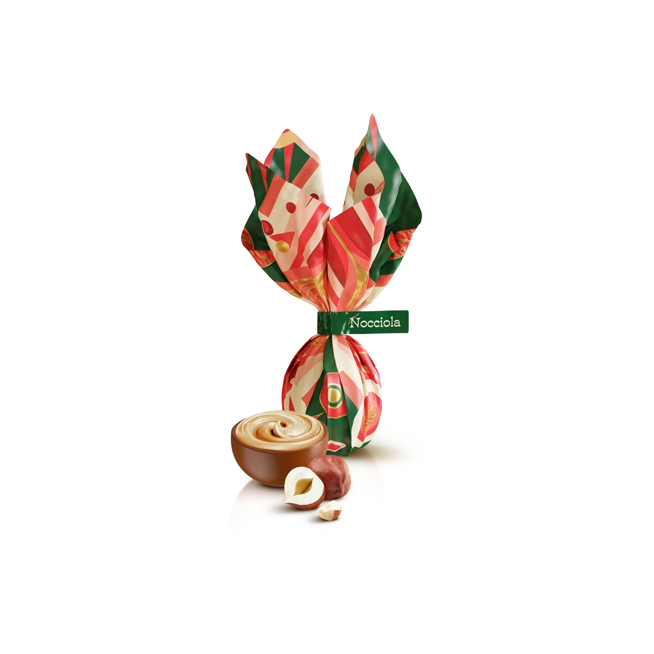 Die Christmas Boule Nocciola ist eine Kugel aus Milchschokolade mit einer weichen Füllung aus Schokolade und Haselnusspaste und ist in einer eleganten, weihnachtlich gestalteten Verpackung erhältlich.