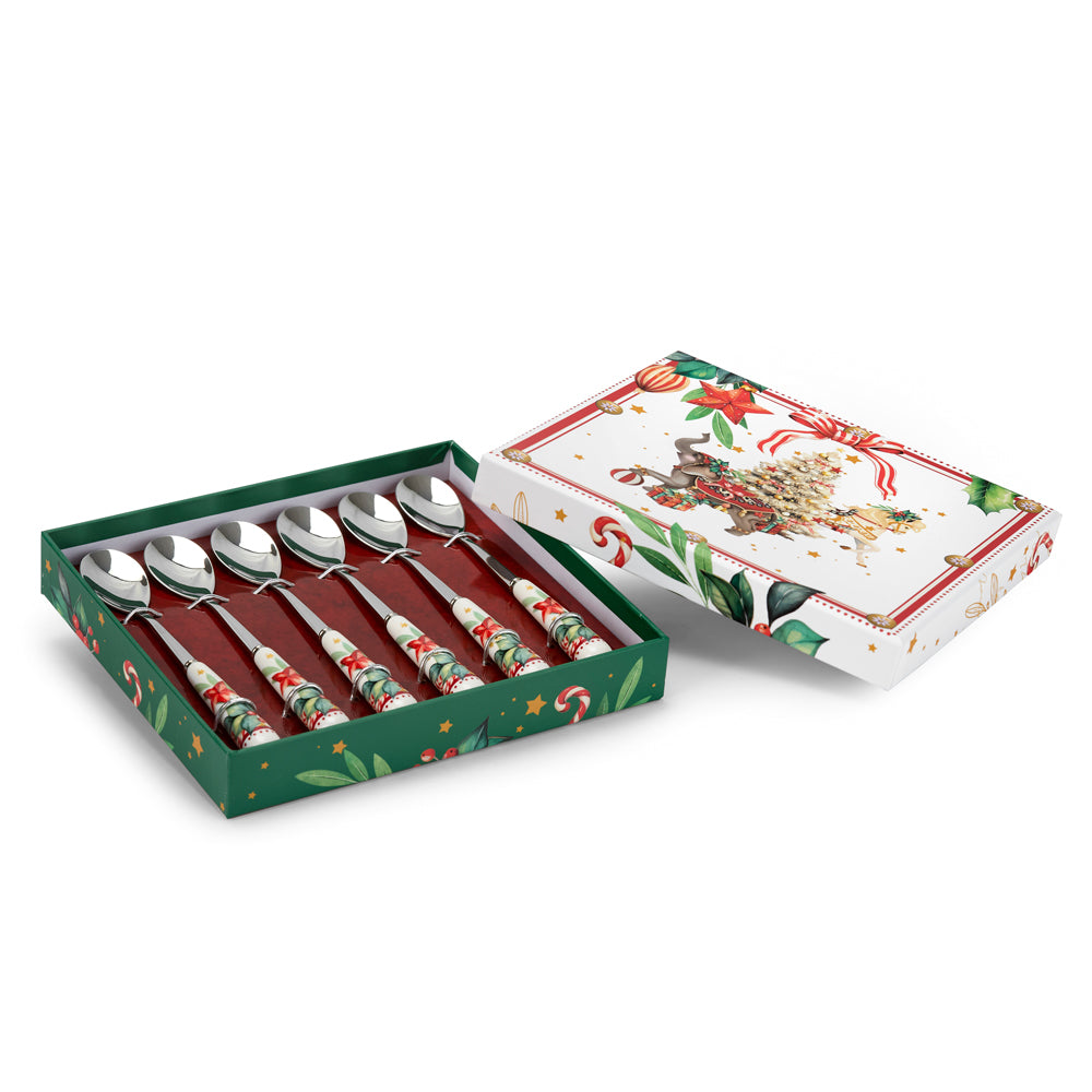 Dieses 6-teilige Astro-Weihnachtslöffel-Set (19 x 17 x 3 cm) verleiht Ihrer Festtafel eine festliche und elegante Note. Ob zu Desserts, Kräutertees oder Kaffee – die Löffel vereinen Funktionalität mit einem weihnachtlichen Design, das die magische Atmosphäre der Weihnachtszeit einfängt und jeden geselligen Moment zu etwas ganz Besonderem macht. Wählen Sie diese Löffel als elegantes Detail, das Ihre Gäste begeistern und Ihre Festtage bereichern wird.