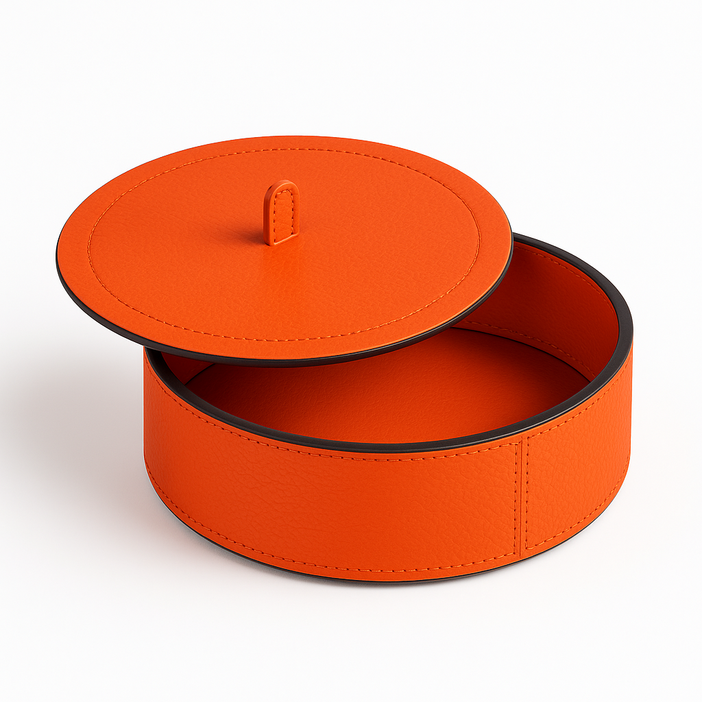 Es eignet sich perfekt zur Aufbewahrung von Kleinigkeiten, Schmuck oder Schreibtischzubehör und verleiht sowohl privaten als auch professionellen Umgebungen einen Hauch von Eleganz. Der Deckel mit einer Lasche in der Mitte erleichtert das Öffnen, während die starre Struktur für Stärke und Stabilität sorgt.