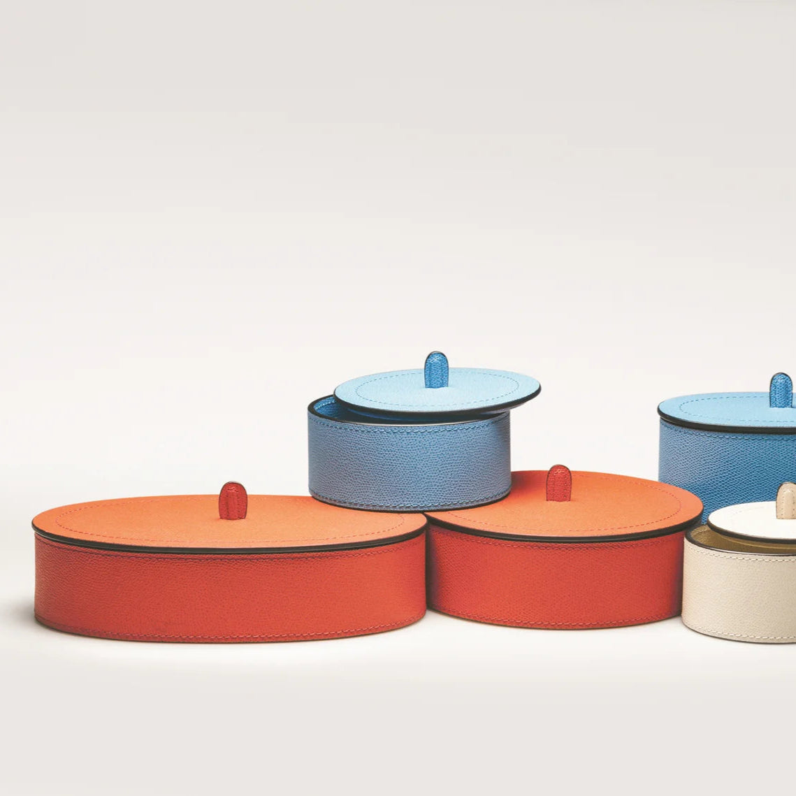 Schlichtes Design und handwerkliche Sorgfalt zeichnen die Aufbewahrungsbox Harris von Giobagnara aus, die aus feinem Leder mit geprägtem mangofarbenem Finish gefertigt ist.