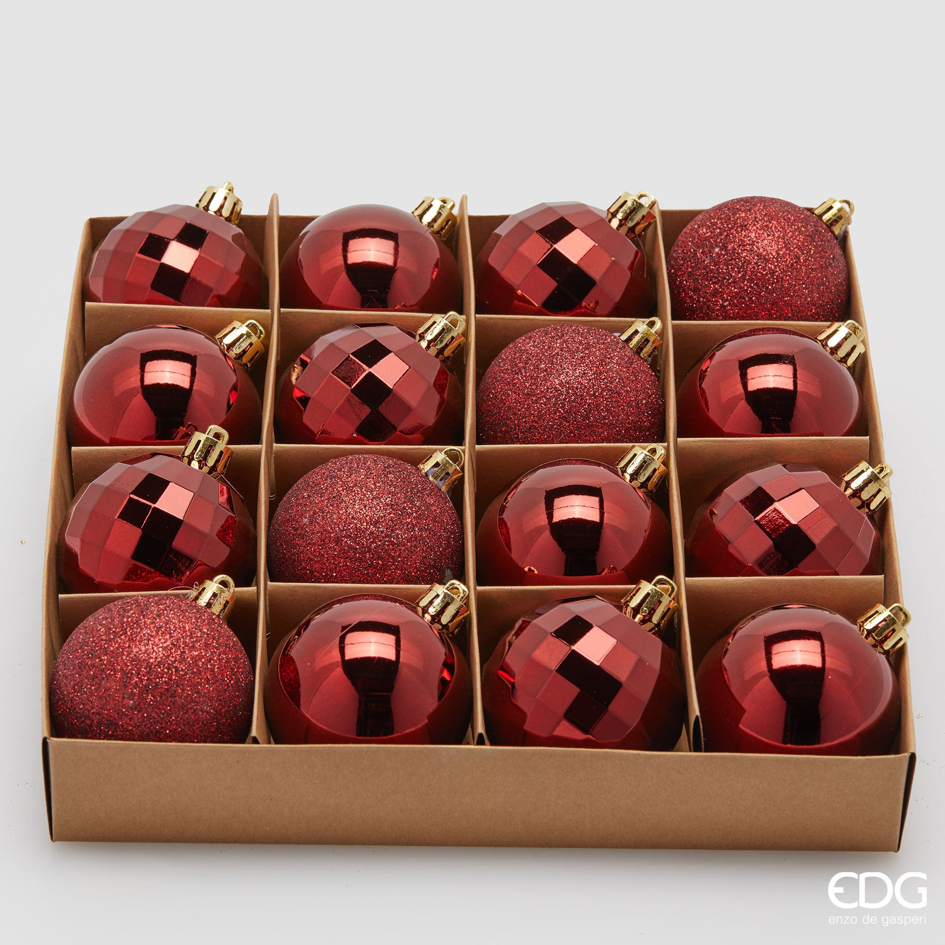 With the Box of 16 Christmas Balls from the Enzo De Gasperi company you can create pleasant Christmas decorations on the Christmas tree, on a garland, or you can use them to embellish a Christmas door wreath.