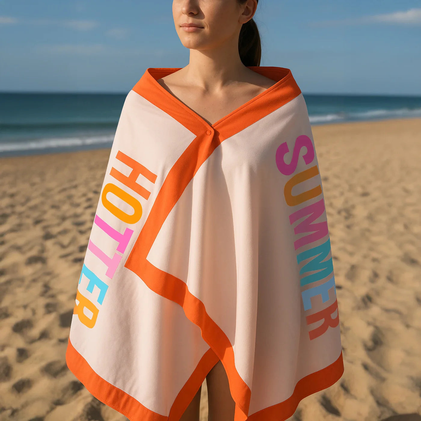 The colorful "Hotter Than Last Summer" print in multicolored characters adds a fun and trendy touch, ideal for those who love to stand out in the sun.