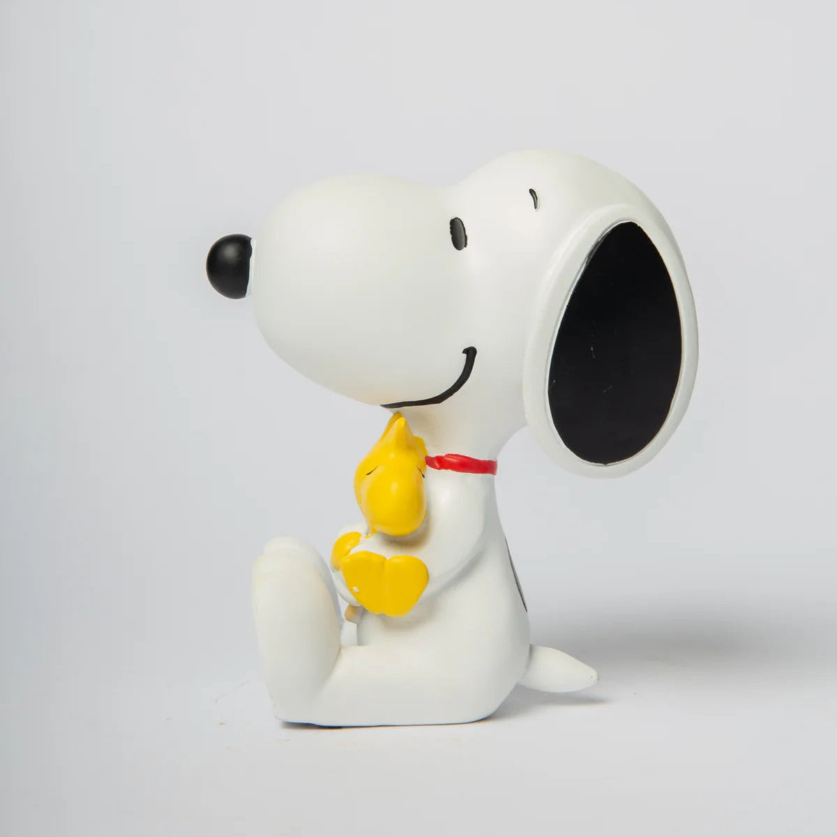 Made of high-quality matte white resin and 12 cm tall, it depicts Snoopy and his inseparable friend Woodstock in a tender embrace that conveys affection and serenity.