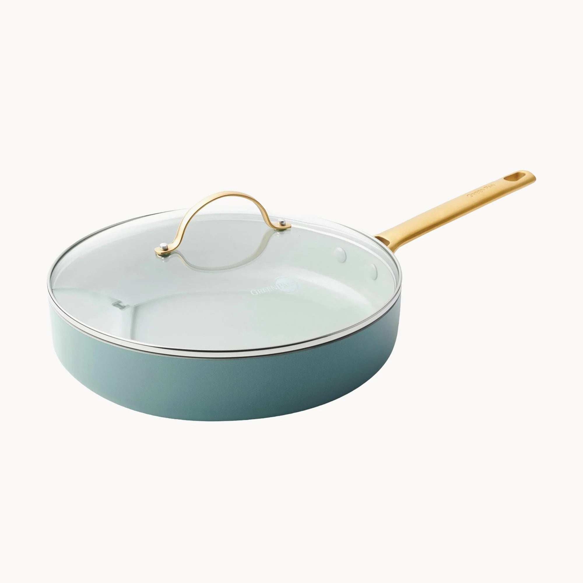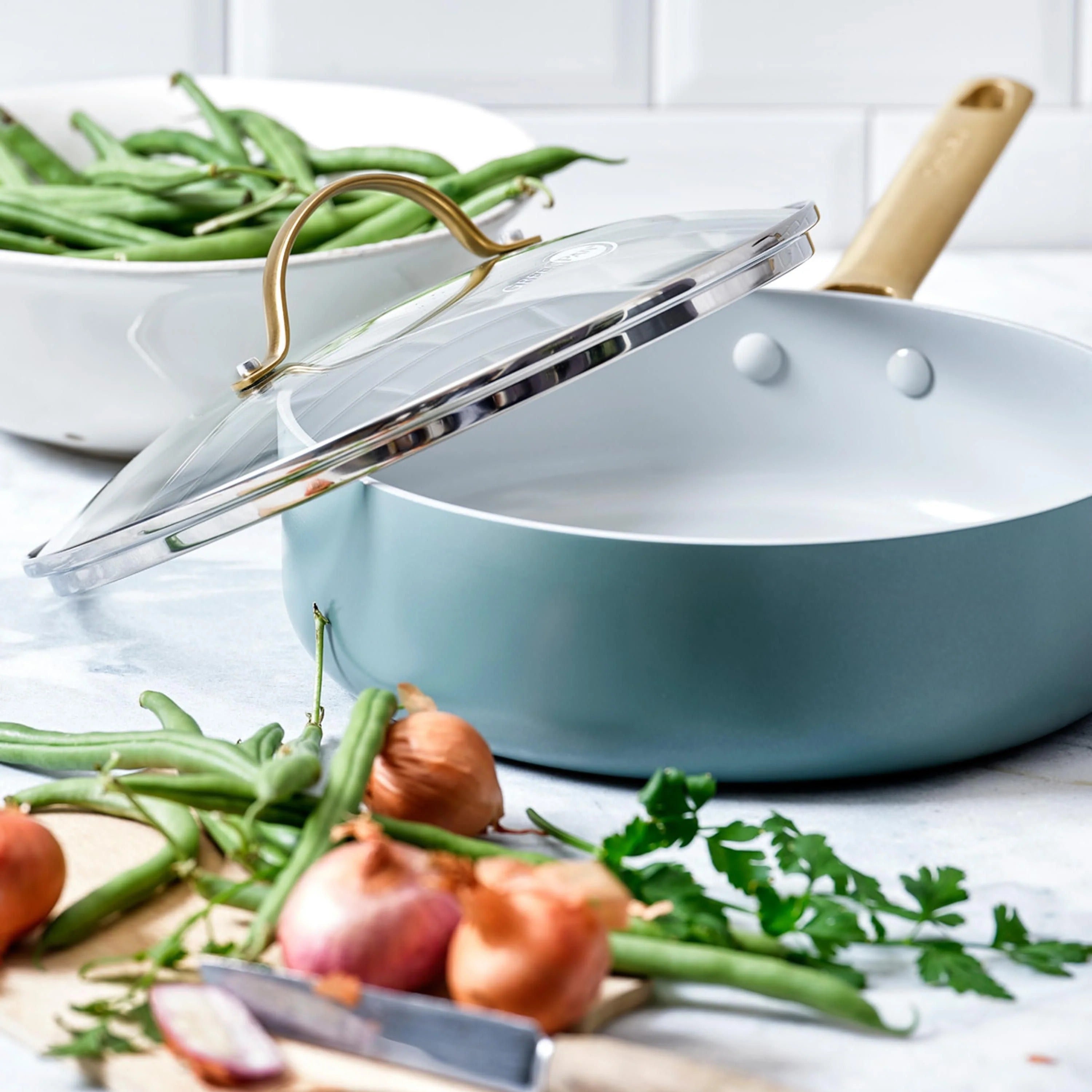 Revolutionize your kitchen with the GreenPan Padova 28 cm frying pan with lid, elegant in the Sky Blue finish and designed for healthy, functional and designer cooking. The Thermolon™ Infinity ceramic non-stick coating is free of PFAS, PFOA, lead and cadmium, for safe and natural cooking, with less fat and without toxic releases.