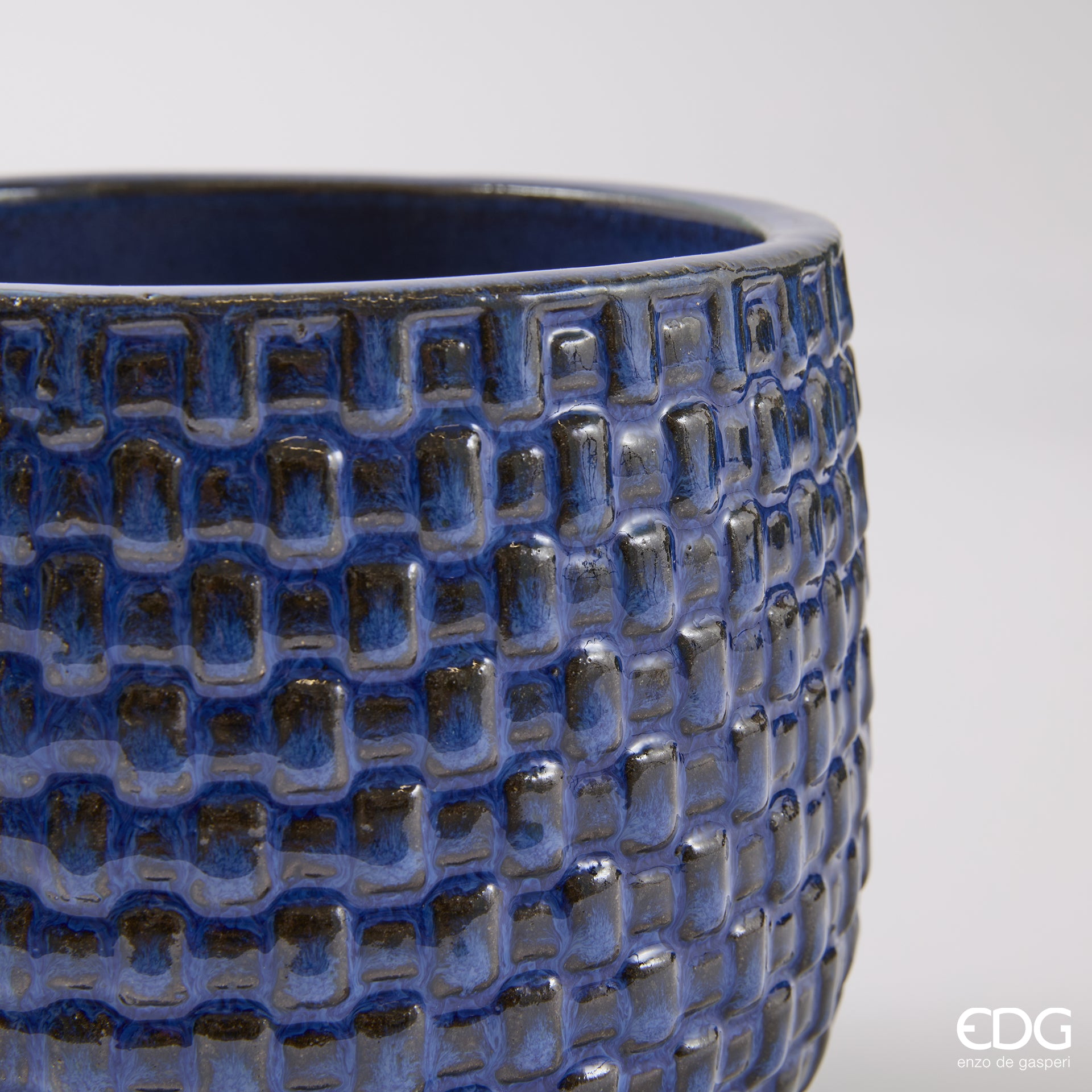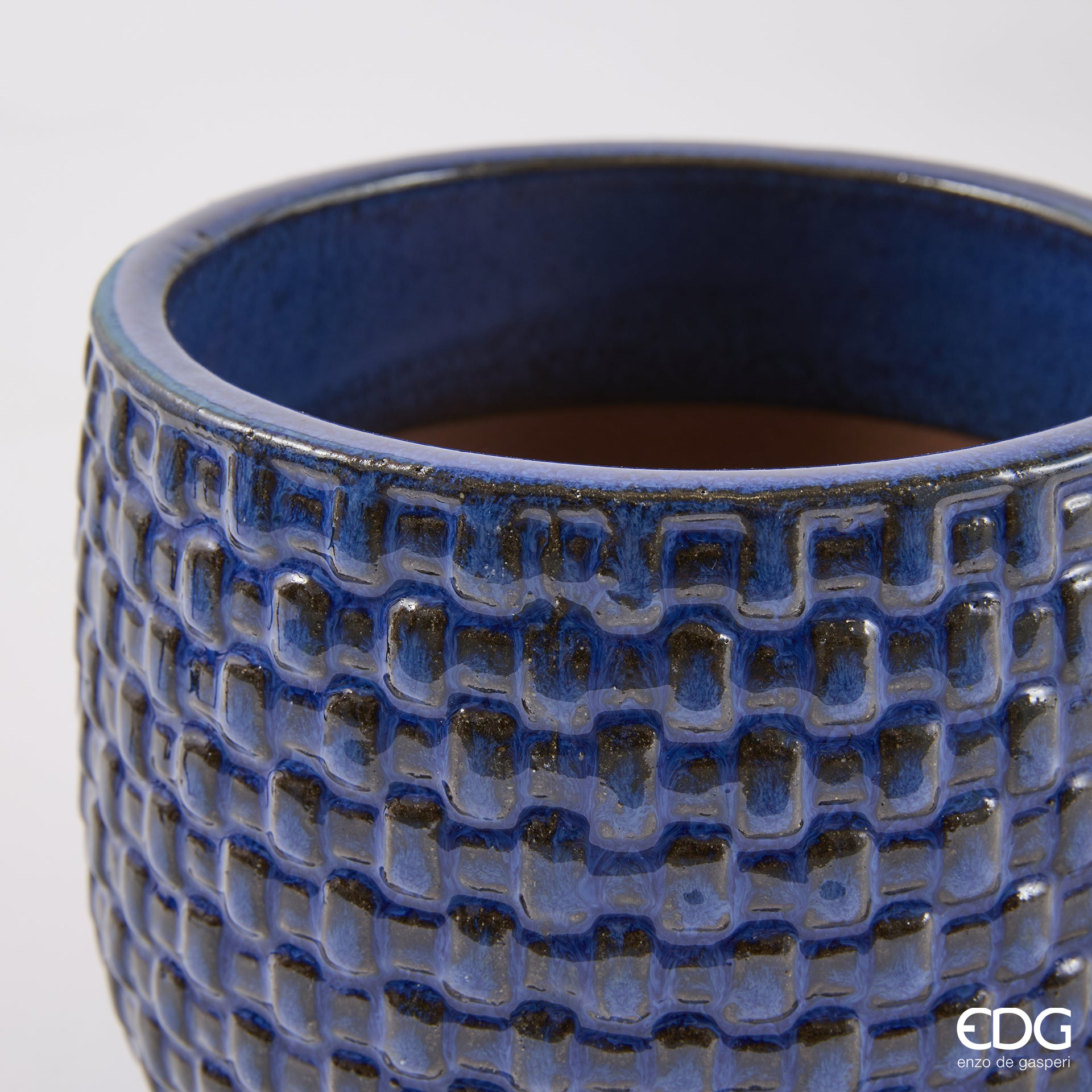 La finitura in colore blu esalta la texture geometrica della superficie, creando profondità visiva e riflessi luminosi che valorizzano piante e composizioni verdi. Il design ricercato rende questo set perfetto per terrazze, porticati, bordi piscina e ambienti outdoor di stile contemporaneo o mediterraneo.
