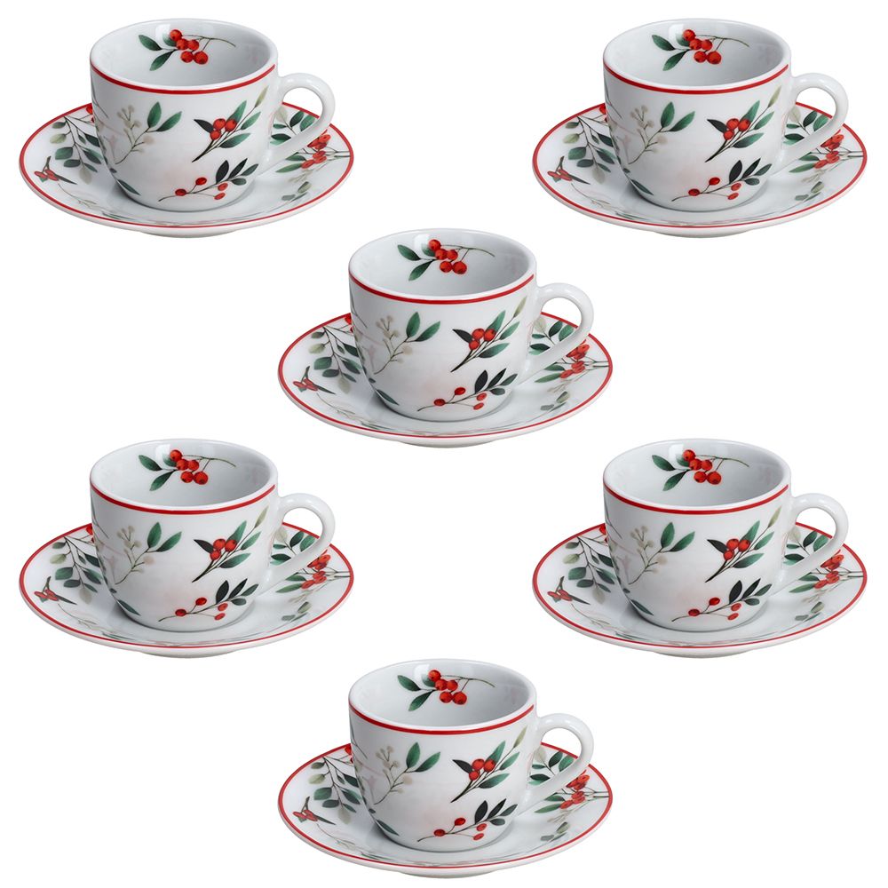 The 24-piece Hollyberry dinnerware set is designed to transform your holiday table into a riot of color and a festive atmosphere. Crafted from porcelain and consisting of six 27 cm dinner plates, six 22 cm soup plates, six 19 cm dessert plates, and six espresso cups and saucers, it stands out for its vibrant and dramatic decoration: deep green holly sprigs with red berries intertwined against a bright white background, embellished with an elegant scarlet red border that frames the plates. The effect is warm, welcoming, and instantly Christmassy, perfect for creating a convivial and cheerful table setting. Durable and functional, it is dishwasher and microwave safe. An ideal set for those who want to bring all the magic of the holidays to the table.
