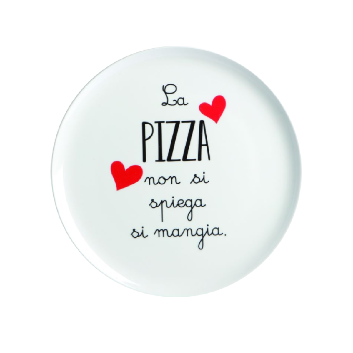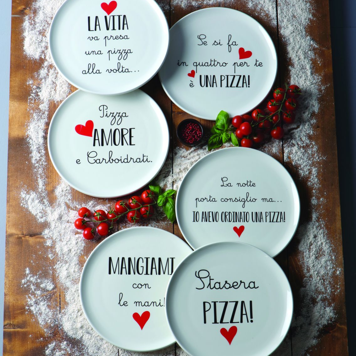 Pizza by Love Tiffani is ideal for those who love to serve pizza with originality and a pinch of irony. Made of premium Ceramic, they have a diameter of 31 cm and feature assorted witty and romantic writings dedicated to pizza, with themed graphics and small red heart-shaped details.