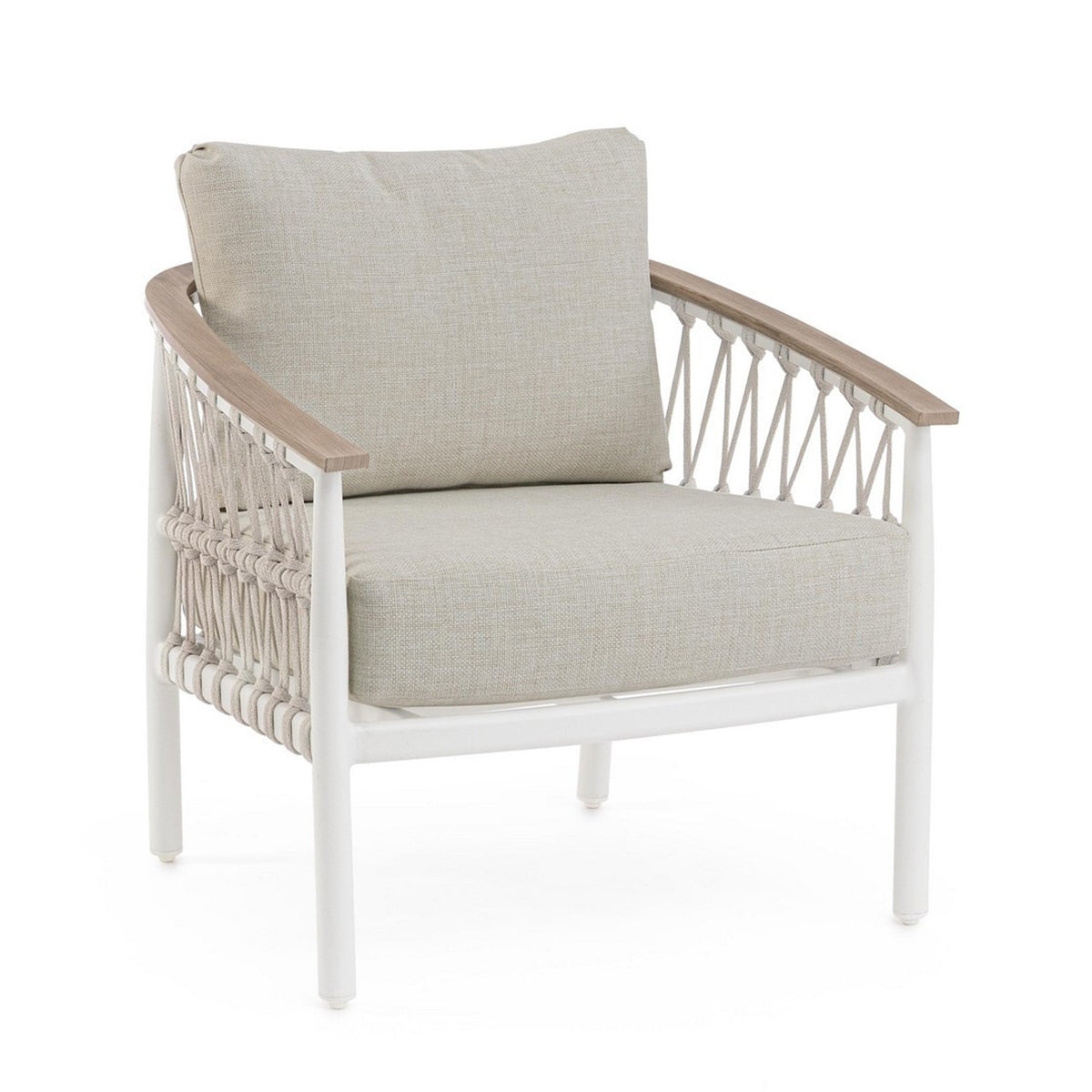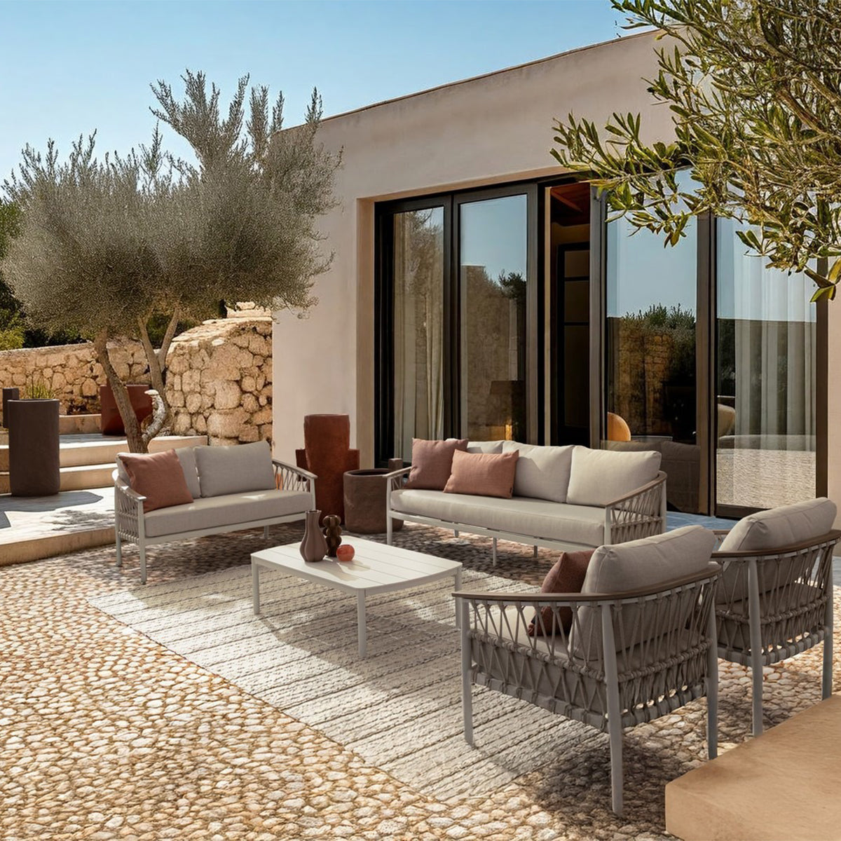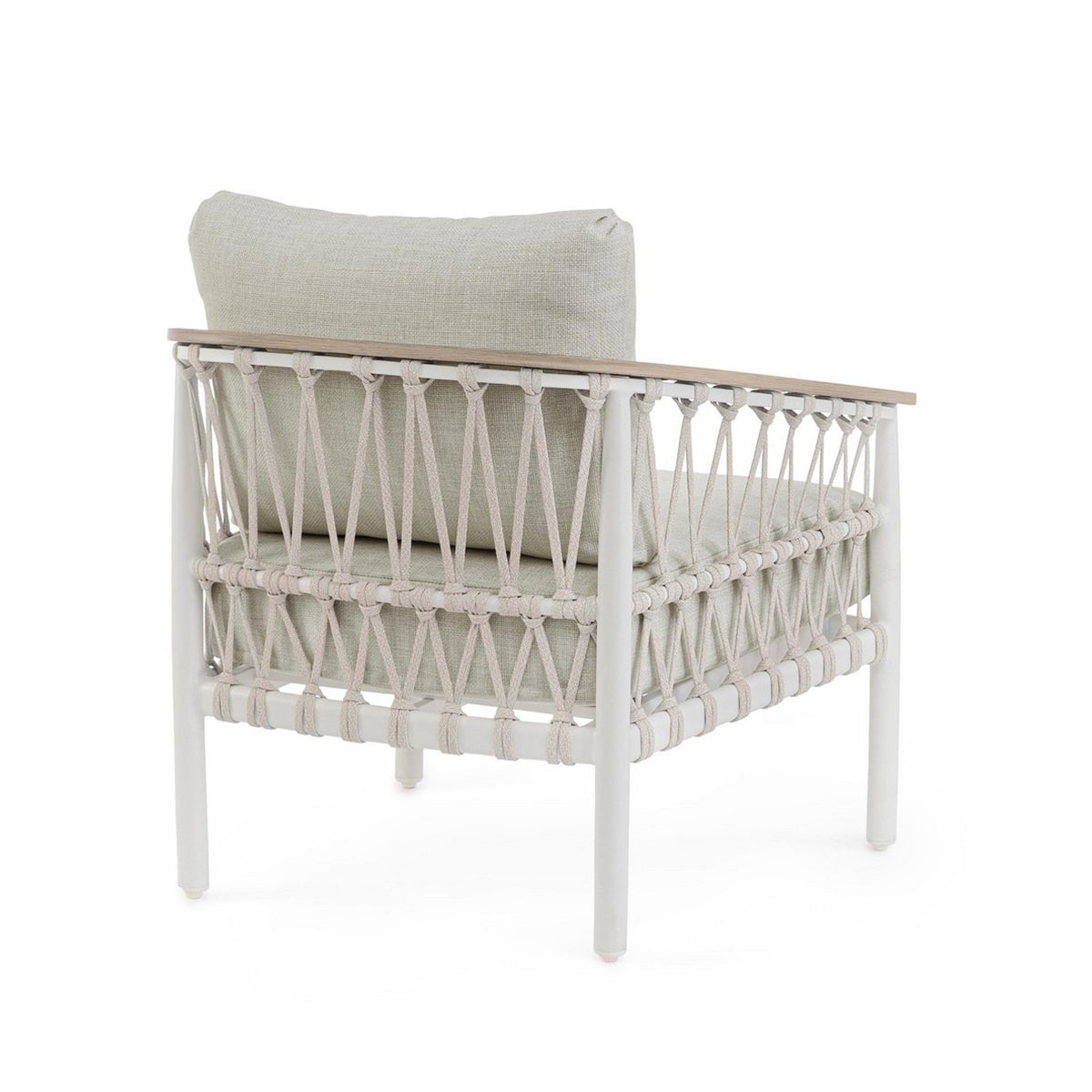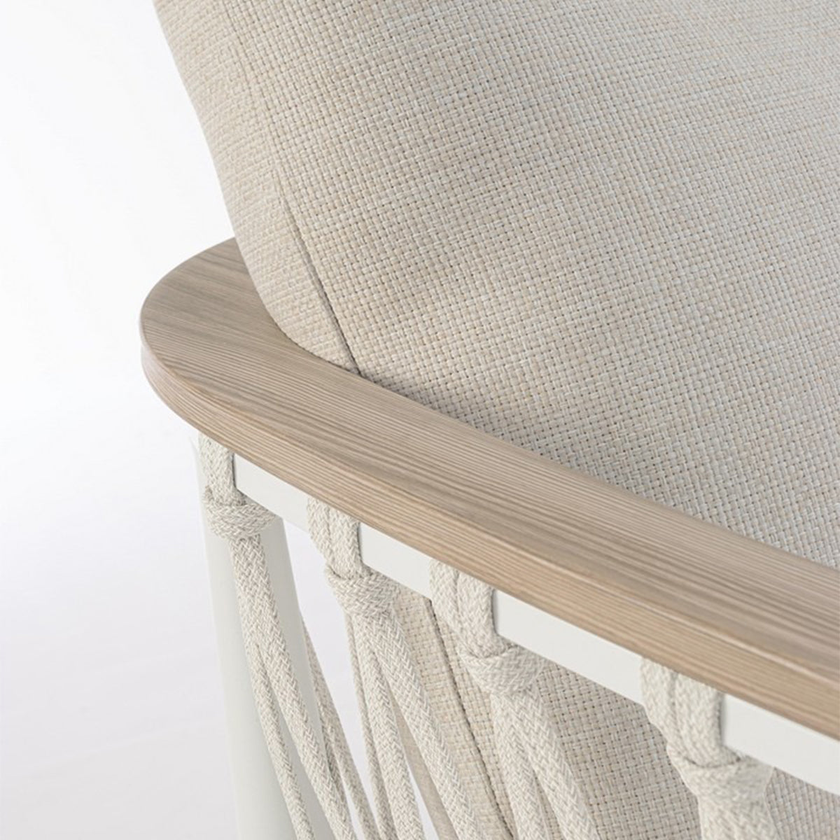 I braccioli in alluminio con finitura effetto legno, impreziositi da un elegante intreccio in corde textilene, conferiscono al salotto un’estetica moderna e naturale, unendo design ricercato e comfort visivo. I cuscini di seduta e schienale, inclusi e sfoderabili, sono realizzati in tessuto idrorepellente Olefin (100% polipropilene), progettato per resistere a umidità, raggi solari e usura, assicurando praticità e comodità anche in ambienti esterni.