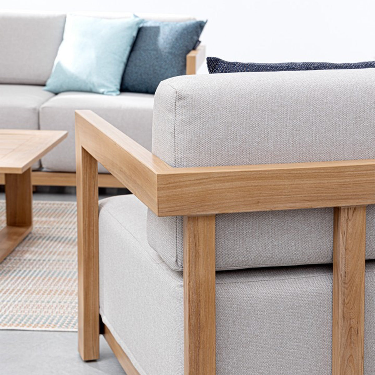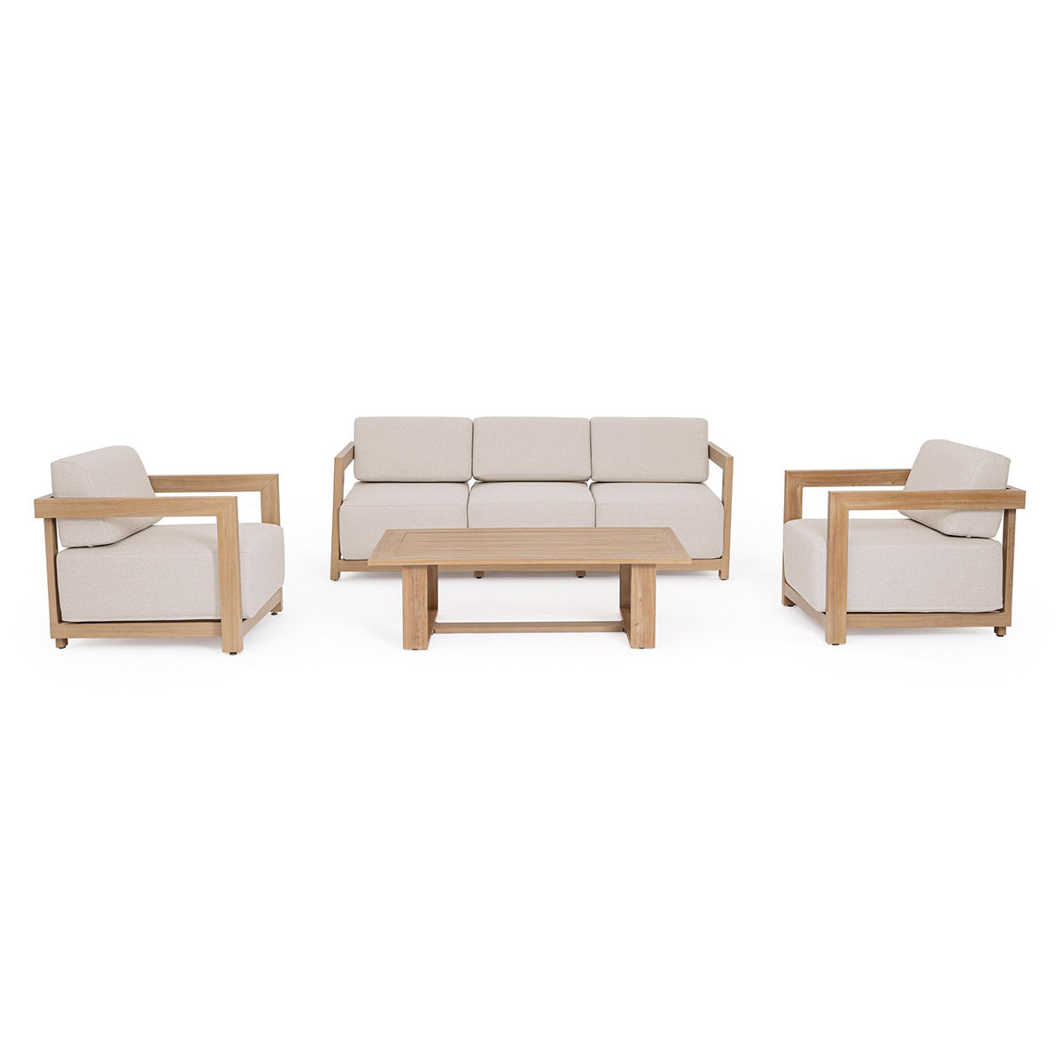Il salotto da esterno Theseus naturale Andrea Bizzotto è una soluzione premium pensata per arredare con eleganza e comfort giardini, terrazze e spazi outdoor. La struttura è realizzata in alluminio verniciato a polvere (poliestere) con finitura effetto legno, una combinazione che unisce la resistenza dell’alluminio all’estetica calda e naturale del legno, garantendo durabilità e facilità di manutenzione.