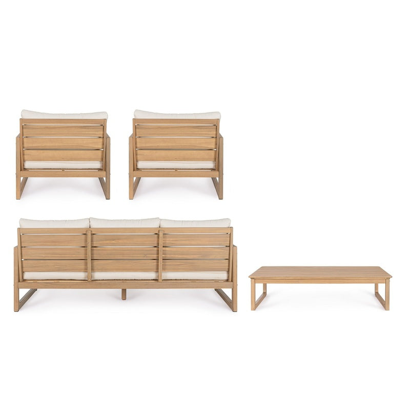 La struttura presenta una raffinata finitura a olio effetto teak, che valorizza le venature del legno e dona al set un aspetto caldo e naturale, perfetto per ambienti esterni di gusto moderno o mediterraneo. La viteria in acciaio inossidabile assicura maggiore resistenza nel tempo anche in ambienti esposti agli agenti atmosferici.