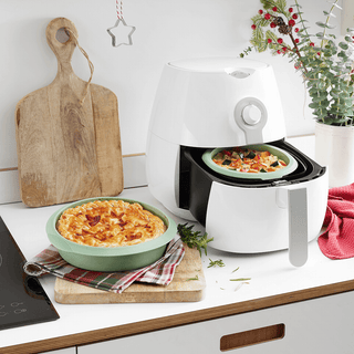 The 20 cm round mold from Lékué, made of 100% food-grade platinum silicone, is designed to be perfectly compatible with most air fryers. Flexible, resistant and non-stick, it is the ideal accessory for preparing cakes, quiches, omelettes, bread and much more, without having to grease the mold.